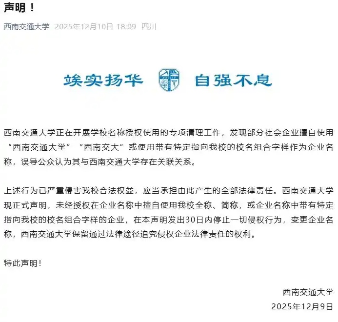 2025年12月10日,西南交通大學發(fā)表聲明稱,該校正在開展學校名稱授權(quán)使用的專項清理工作,發(fā)現(xiàn)部分社會企業(yè)擅自使用“西南交通大學”“西南交大”或使用帶有特定指向該校的校名組合字樣作為企業(yè)名稱,誤導公眾認為其與西南交通大學存在關(guān)聯(lián)關(guān)系。