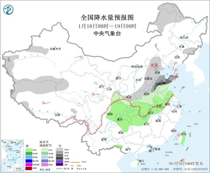 圖1 全國(guó)降水量預(yù)報(bào)圖(1月16日08時(shí)-17日08時(shí))。圖片來(lái)源:中央氣象臺(tái)網(wǎng)站