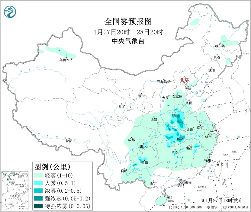 27日夜間至29日,湖北中東部、湖南中北部等地大氣擴散條件一般,有輕至中度霾。此外,27日夜間至28日上午,湖北中東部、湖南北部等地的部分地區(qū)有大霧,局地有能見度不足200米的強濃霧。