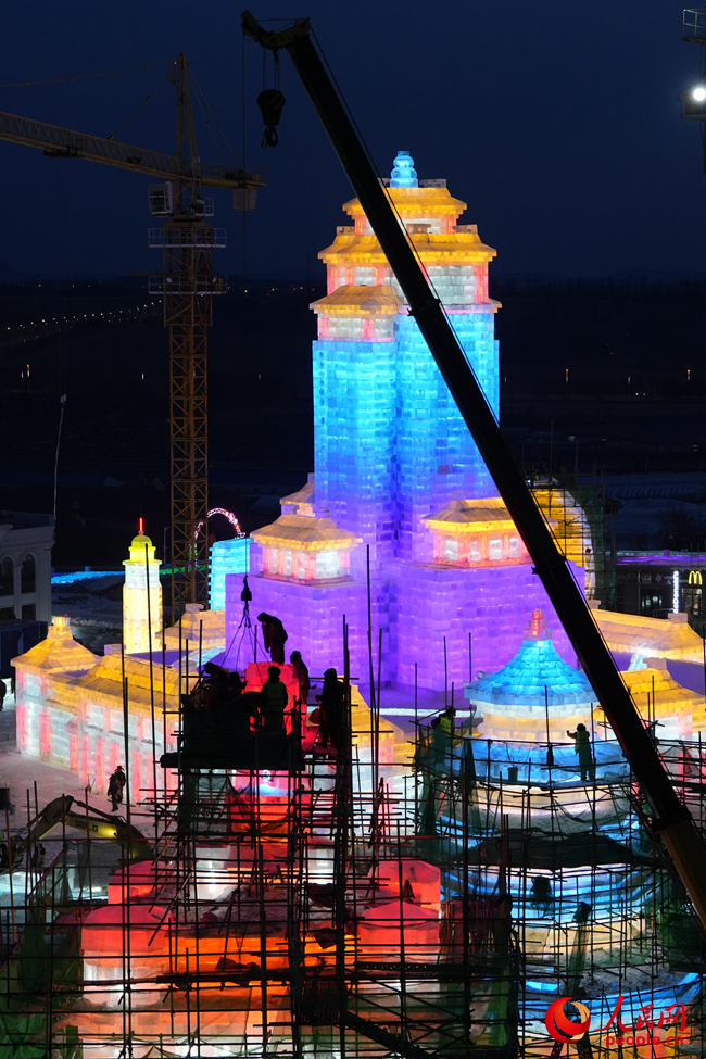 冰為磚、水為泥、燈為飾,打基礎(chǔ)、做鋼架、砌冰墻……最忙時,曲超和5500余名工人夜以繼日,在攝氏零下的氣溫中“玩冰嬉雪”,睫毛上全是凝結(jié)的霜花?!氨┦嵌虝旱乃囆g(shù),一旦進入冰雪施工季,都得緊抓時間,盡量把施工時間壓縮到最短,這樣留給游客欣賞的時間就會更長?!鼻f。