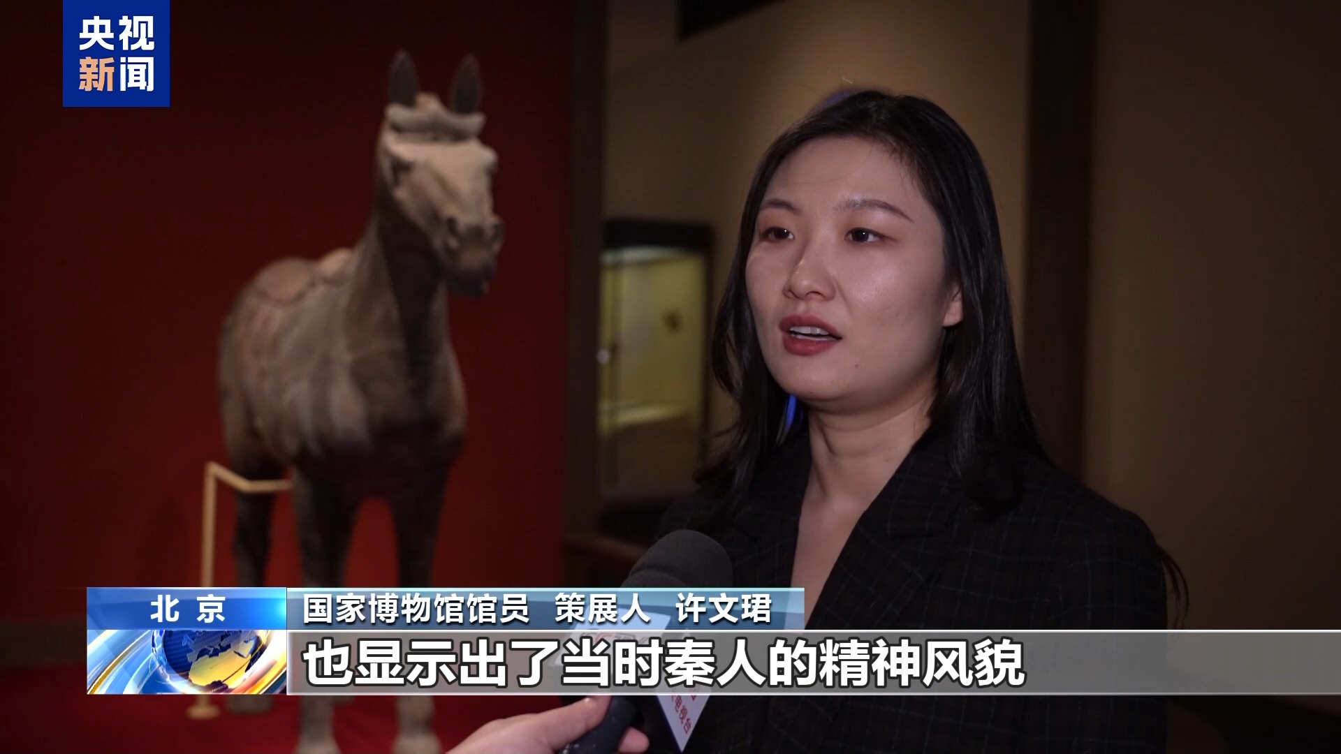 國家博物館館員、策展人 許文珺:這一件秦始皇帝陵兵馬俑的秦鞍馬,雙蹄直立,它的耳朵是直立的,尾巴也是梳成一個辮狀,整體非常有力量,也是秦代人對戰(zhàn)馬篩選標準非常嚴格的體現(xiàn),也顯示出了當時秦人的一個精神風(fēng)貌。