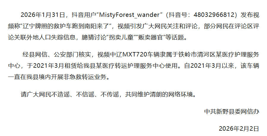 中國(guó)網(wǎng)2月2日訊 據(jù)“新野發(fā)布”微信公眾號(hào)消息,2月2日上午,河南省南陽(yáng)市新野縣委網(wǎng)信辦發(fā)布情況說(shuō)明稱(chēng),2026年1月31日,抖音用戶(hù)“MistyForest_wander”(抖音號(hào):48032966812)發(fā)布視頻稱(chēng)“遼寧牌照的救護(hù)車(chē)跑到南陽(yáng)來(lái)了”,視頻引發(fā)廣大網(wǎng)民關(guān)注和評(píng)論,部分網(wǎng)民在評(píng)論區(qū)評(píng)論關(guān)聯(lián)外地人口失蹤信息,臆猜討論“拐賣(mài)兒童”“販賣(mài)器官”等話題。