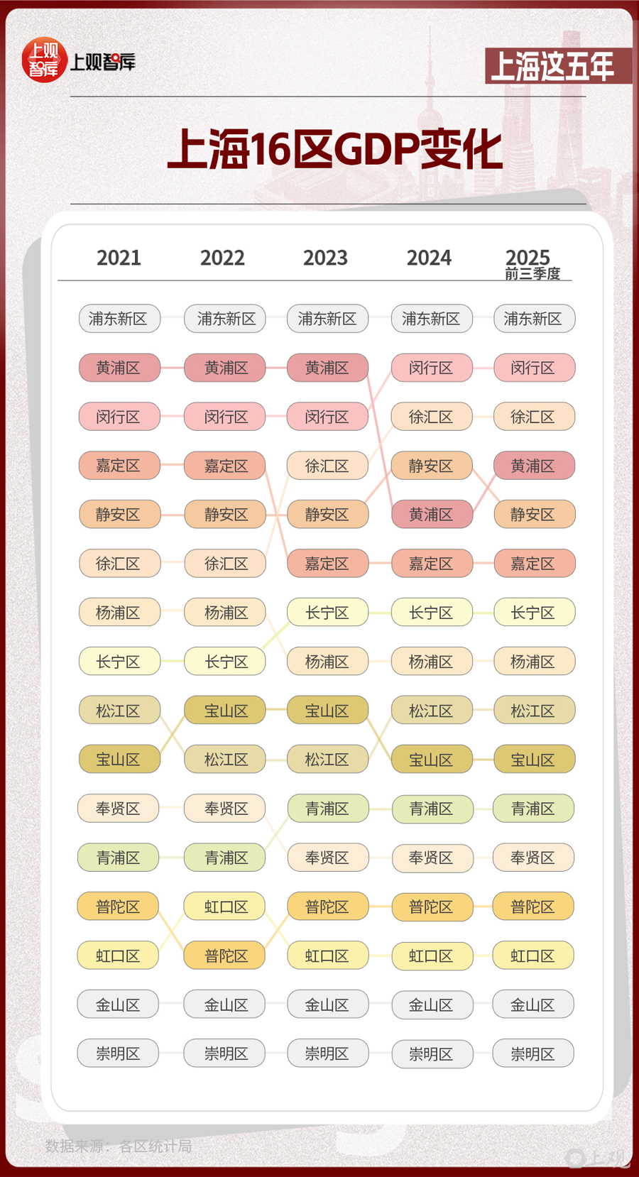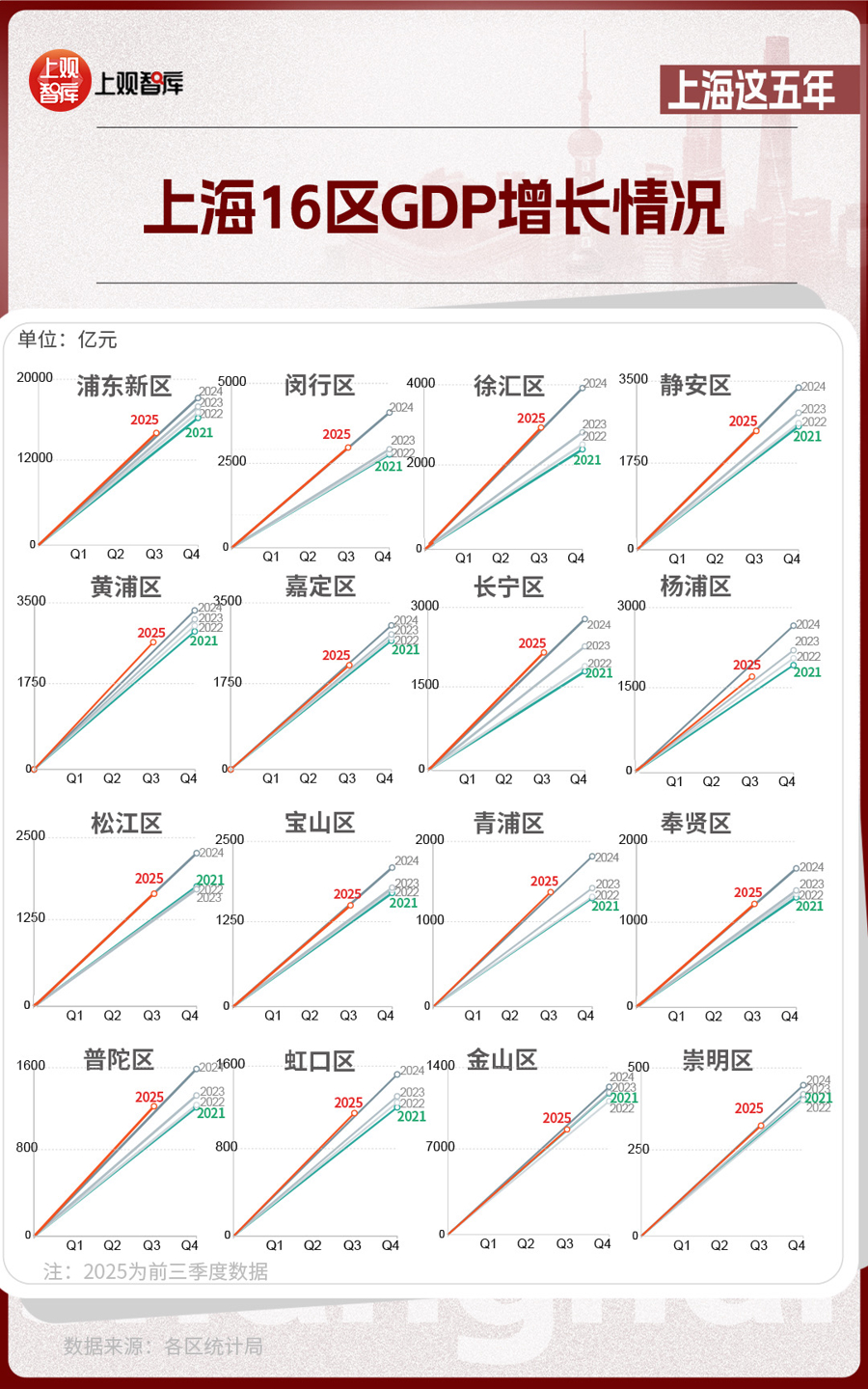 區(qū)域層面,上海16區(qū)GDP的變化,體現(xiàn)出從中心向多極擴散的趨勢。2021年,浦東新區(qū)GDP占全市近36%,而到了2025年,這一比重下降至約33%。其他區(qū)在這五年間,充分發(fā)揮自身優(yōu)勢,齊頭并進,為上海發(fā)展創(chuàng)造了更多增長極。