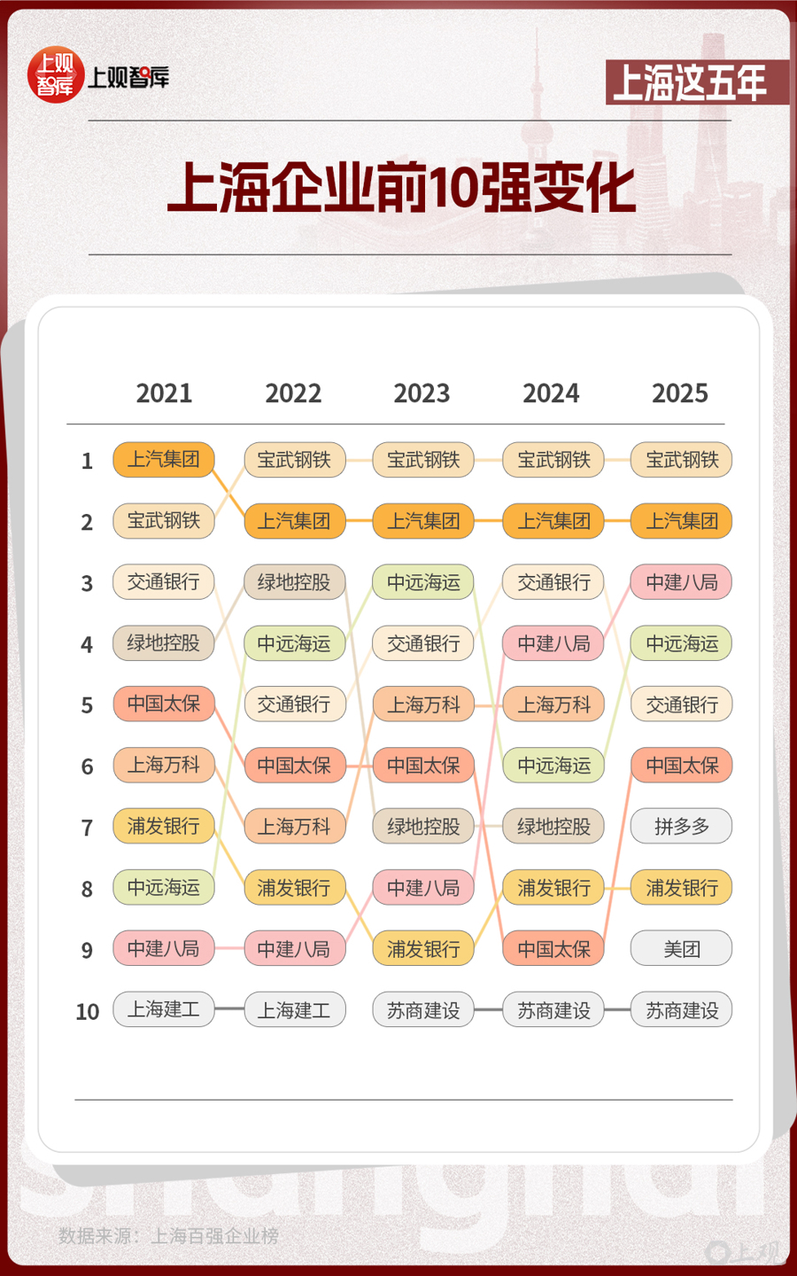 這份由上海市企業(yè)聯(lián)合會、上海市企業(yè)家協(xié)會、上海市經(jīng)濟團體聯(lián)合會和解放日報社共同發(fā)布的榜單,從2021年到2025年,見證了傳統(tǒng)企業(yè)的轉型與創(chuàng)新企業(yè)的涌現(xiàn)。在前10強的名單中,制造業(yè)仍然是上海產(chǎn)業(yè)的壓艙石,而房地產(chǎn)、建筑企業(yè)從2021年占比達40%,到2025年占比降低為20%。互聯(lián)網(wǎng)企業(yè)在2025年沖上前10強,并占據(jù)了20%的席位,亮出了上海經(jīng)濟多元發(fā)展的成績單。