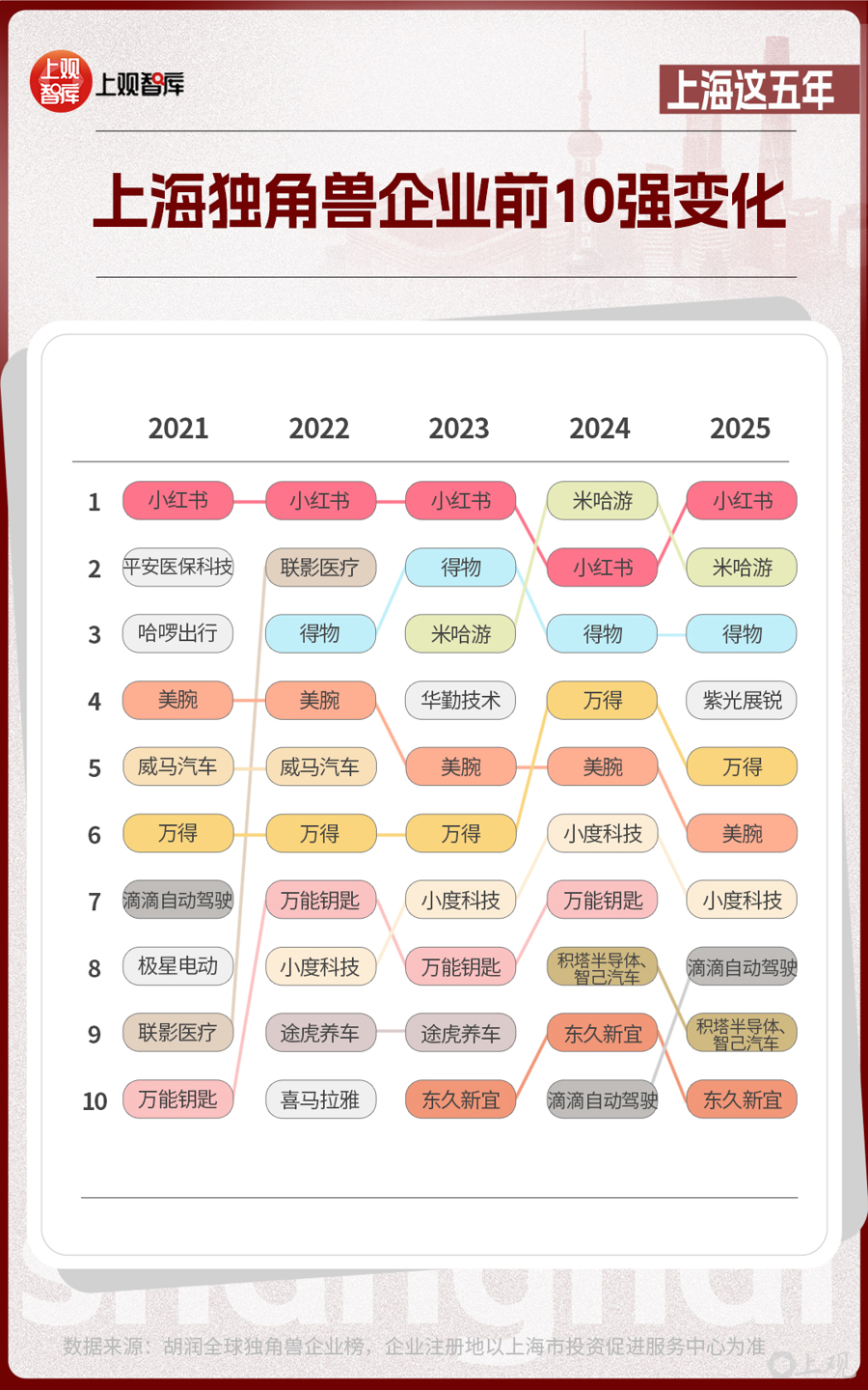 前10位的上海獨角獸企業(yè),從2021年到2025年,發(fā)生了不小的改變。有的企業(yè)已經(jīng)上市,如聯(lián)影醫(yī)療、華勤技術等;有的企業(yè)悄然退場;有的企業(yè)仍持續(xù)霸榜,如小紅書、米哈游、得物、美腕、萬得。獨角獸企業(yè)的變動與產(chǎn)業(yè)趨勢息息相關。當新能源汽車產(chǎn)業(yè)進入高質量發(fā)展的階段時,智己汽車接過領軍大旗;在AI芯片成為市場熱點時,積塔半導體、紫光展銳已躋身芯片新勢力代表之列。