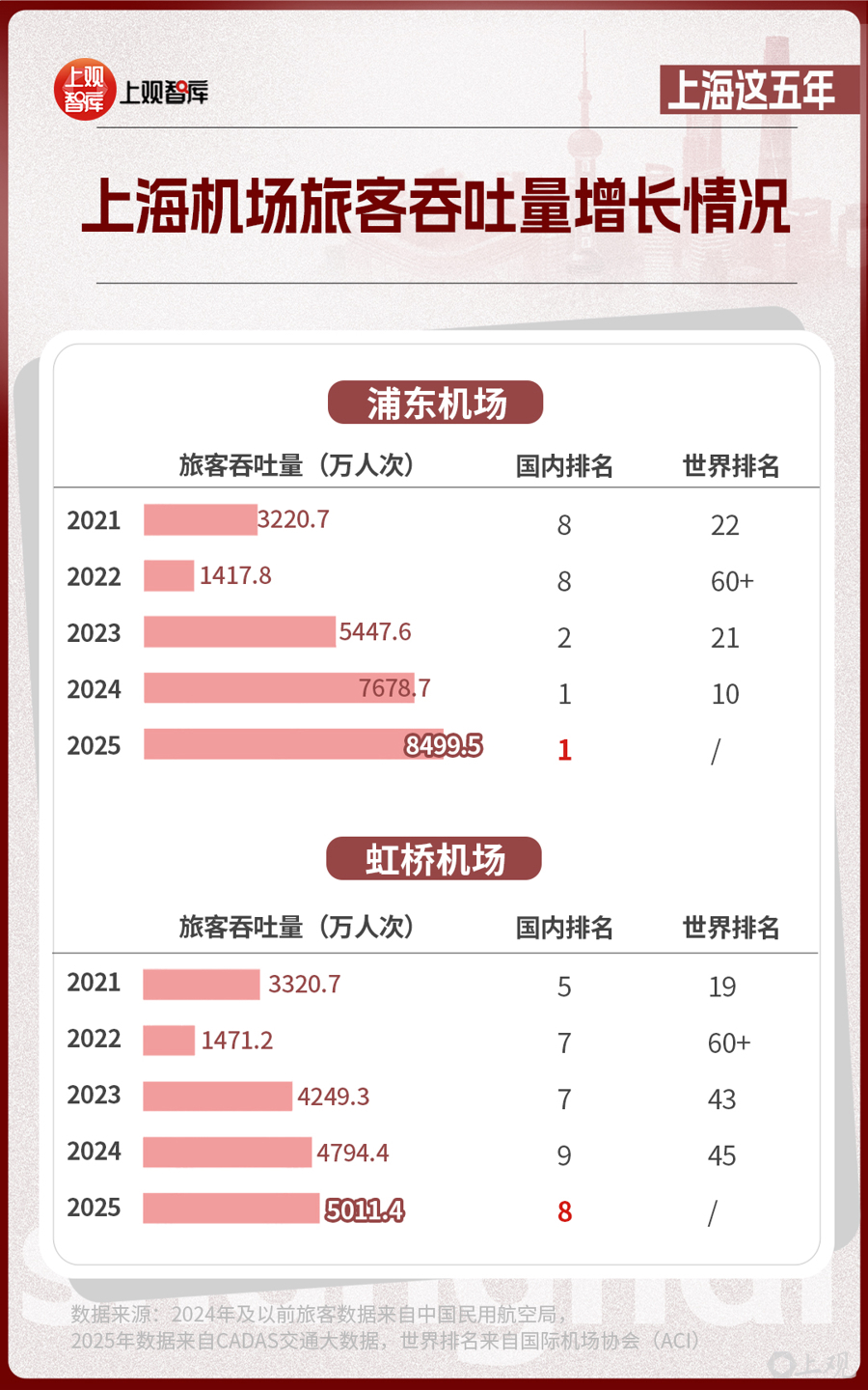 2024年,上海浦東國際機場首次排名全國旅客吞吐量第一,榮登中國最繁忙的機場。也是在這一年,上海港成為全球首個年吞吐量超過5000萬標準箱的世界大港。