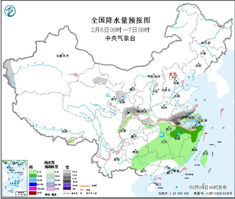 2月6日08時(shí)至7日08時(shí),新疆南部、甘肅河西和中南部、陜西中南部、湖北北部、河南南部、安徽中南部、江蘇中南部、上海、浙江北部等地部分地區(qū)有小到中雪或雨夾雪,其中,陜西中部、河南南部、安徽中南部、江蘇中南部、浙江北部等地部分地區(qū)有大到暴雪或雨夾雪,安徽西南部局地大暴雪(20~21毫米)。江漢東部、江南大部、重慶東北部、華南北部、廣西西南部、廣東東南部、臺灣島等地部分地區(qū)有小到中雨,其中,浙江北部等地部分地區(qū)有大雨(25~28毫米)。黑龍江東北部、青海東部、新疆南疆盆地等地部分地區(qū)有4~6級風(fēng),陣風(fēng)6~7級,東海大部、臺灣海峽將有6~8級風(fēng)、陣風(fēng)9級,黃海中部和南部、臺灣以東洋面、南海東北部將有5~7級風(fēng)、陣風(fēng)8級。