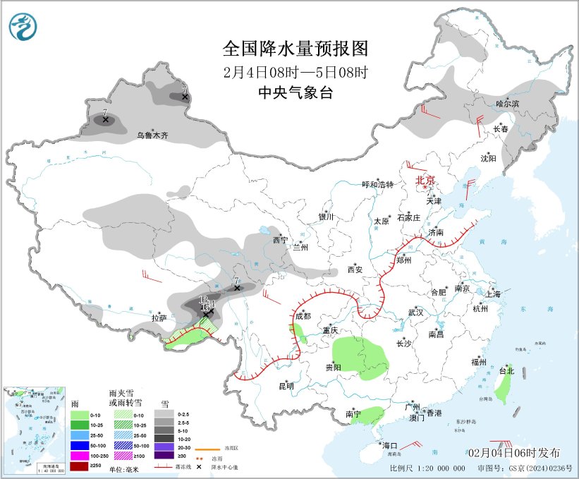 2月4日08時(shí)至5日08時(shí),內(nèi)蒙古東北部、東北地區(qū)中東部、新疆北疆大部和南疆盆地東南部、西藏南部和東部、青海中南部、甘肅南部等地部分地區(qū)有小雪或雨夾雪,其中,新疆北疆東部和伊犁河谷、西藏東部等地部分地區(qū)有中到大雪,局地暴雪(10~15毫米)。四川盆地西南部、貴州東部、湖南西部、廣西東南部、廣東西南部、臺灣島大部等地部分地區(qū)有小雨。內(nèi)蒙古東南部和中部、河北北部、西藏北部、川西高原北部等地部分地區(qū)有4~5級風(fēng),陣風(fēng)6~7級,南海東北部將有5~7級風(fēng)、陣風(fēng)8級。