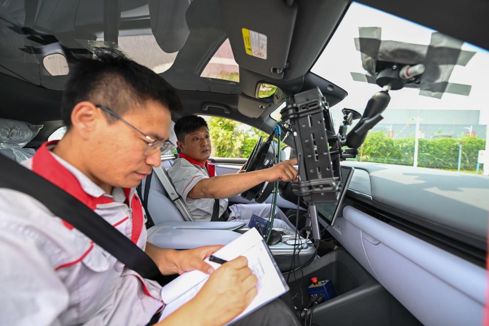 測(cè)試員在一輛智能網(wǎng)聯(lián)汽車(chē)內(nèi)做測(cè)試。新華社記者 孫凡越 攝