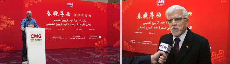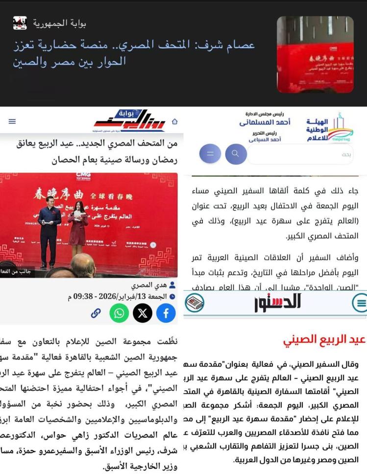 當(dāng)?shù)貢r(shí)間2月13日,“春晚序曲 全球看春晚”埃及專場活動(dòng)在開羅舉行。本次活動(dòng)由中國中央廣播電視總臺(tái)與中國駐埃及大使館、埃及旅游和文物部、埃及旅游促進(jìn)局共同主辦。中宣部副部長、中央廣播電視總臺(tái)臺(tái)長慎海雄作視頻致辭。中國駐埃及大使兼駐阿盟全權(quán)代表廖力強(qiáng),埃及政府代表、埃及外交部亞洲事務(wù)部助哈姆扎,埃及前總理沙拉夫出席活動(dòng)并致辭。埃及考古學(xué)家、前文物部長哈瓦斯,埃及旅游促進(jìn)局主席代拉提芙,埃及外交事務(wù)委員會(huì)執(zhí)行主任伊扎特,巴德爾大學(xué)副校長巴斯歐尼,阿盟非洲事務(wù)司司長布斯坦吉,阿盟理事會(huì)秘書處主任法赫米等中埃兩國政界、學(xué)術(shù)界、媒體界代表200余名嘉賓參加活動(dòng)。
