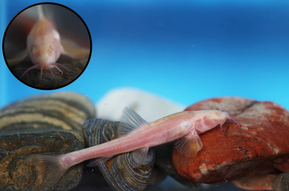 這是“納雍盲高原鰍”的活體圖,其身體呈現(xiàn)透明淡粉色,鱗片消失,眼睛退化為小黑點(diǎn)。(受訪者供圖)