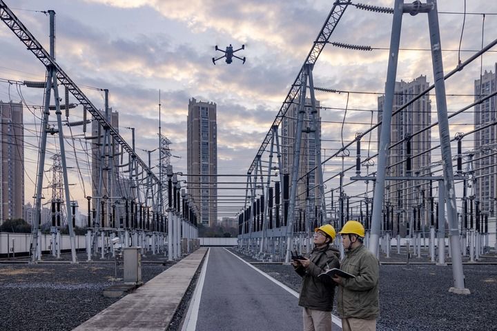 2月17日,國網(wǎng)泰州供電公司運(yùn)維人員在220千伏寺巷變電站利用無人機(jī)巡檢電力設(shè)備。新華社發(fā)(湯德宏 攝)