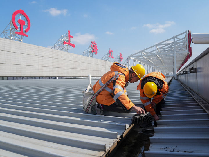 2月17日,中國鐵路上海局集團(tuán)有限公司上海房建公寓段的工作人員在上海虹橋火車站的屋面鋼結(jié)構(gòu)上清理垃圾。新華社記者 丁汀 攝