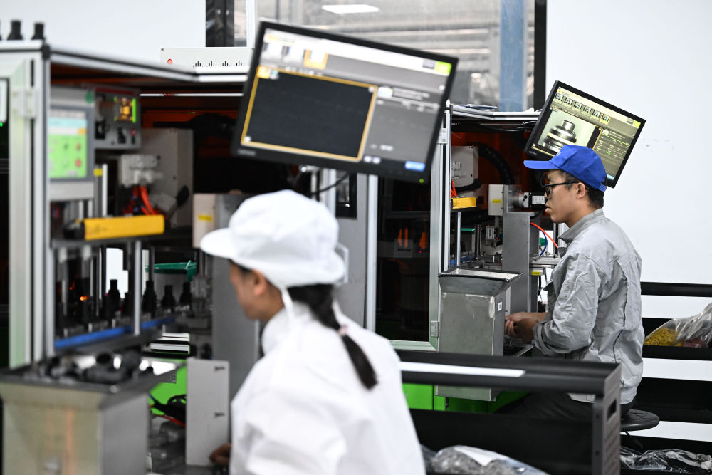 工作人員在天津鵬翎集團(tuán)股份有限公司生產(chǎn)車間操作半自動(dòng)生產(chǎn)設(shè)備生產(chǎn)汽車膠管接頭。新華社記者 趙子碩 攝