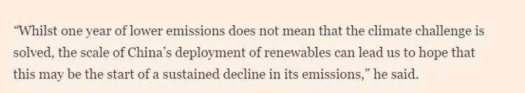 同時(shí),文章稱南安普頓大學(xué)的一位氣候科學(xué)家表示,這些數(shù)據(jù)令人鼓舞,因?yàn)樗鼈儽砻髦袊鴮G色能源的大規(guī)模投資開始轉(zhuǎn)化為可衡量的成果?!半m然一年的減排并不意味著氣候挑戰(zhàn)已經(jīng)解決,但中國在可再生能源方面的大規(guī)模發(fā)展讓我們有理由期待,這或許將是其排放量持續(xù)下降的開端?!?/p>