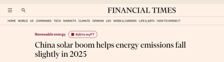英國《金融時(shí)報(bào)》日前發(fā)文稱,2025年,太陽能的蓬勃發(fā)展促使中國的碳排放量有所下降。