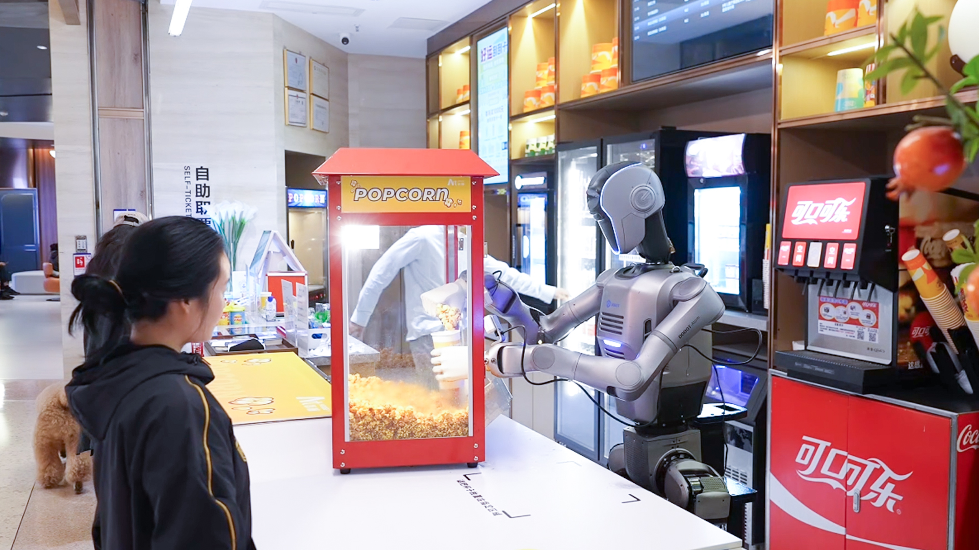 “滴——識(shí)別成功,開始制作?!鄙钲贙11影院的爆米花柜臺(tái)前,人形機(jī)器人抓起一只空紙杯,對(duì)準(zhǔn)出料口,金黃的爆米花簌簌落入杯中,不多不少恰好至刻度線。封口、遞送,動(dòng)作雖機(jī)械但流暢。