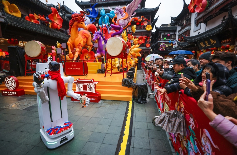 圖為由上海交通大學、上海人工智能研究院孵化的具身智能創(chuàng)業(yè)企業(yè),在豫園燈會中心廣場精心打造了一個未來感十足的智能互動區(qū)。文匯報記者袁婧攝