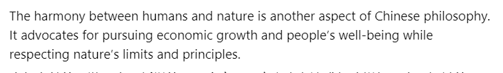 文章還認為,人與自然的和諧是中國哲學的另一個方面。它主張在追求經濟增長和人民福祉的同時,尊重自然的發(fā)展規(guī)律。