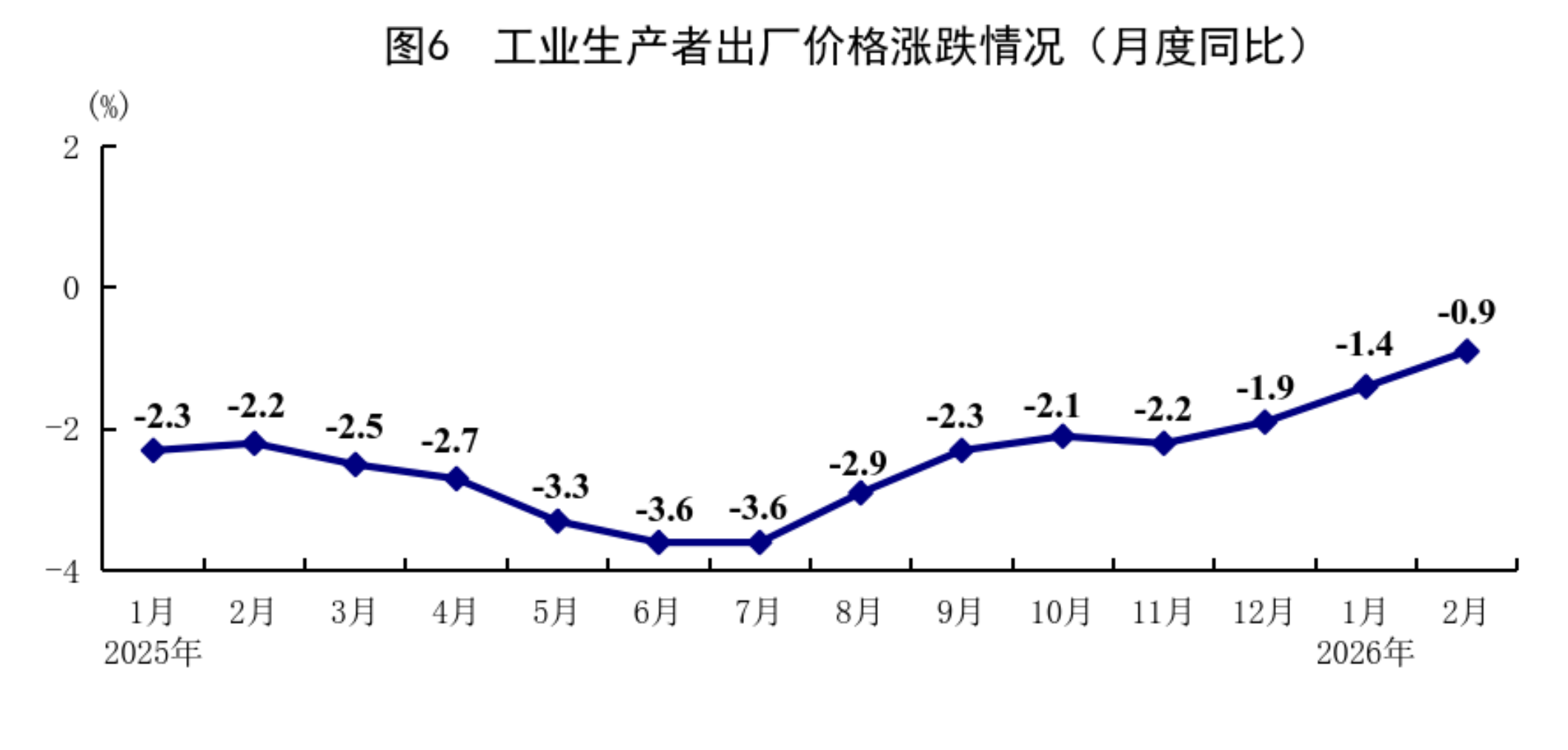 1—2月份,全國工業(yè)生產(chǎn)者出廠價格同比下降1.2%。分月看,1月份同比下降1.4%,環(huán)比上漲0.4%;2月份同比下降0.9%,環(huán)比上漲0.4%。1—2月份,全國工業(yè)生產(chǎn)者購進價格同比下降1.1%。