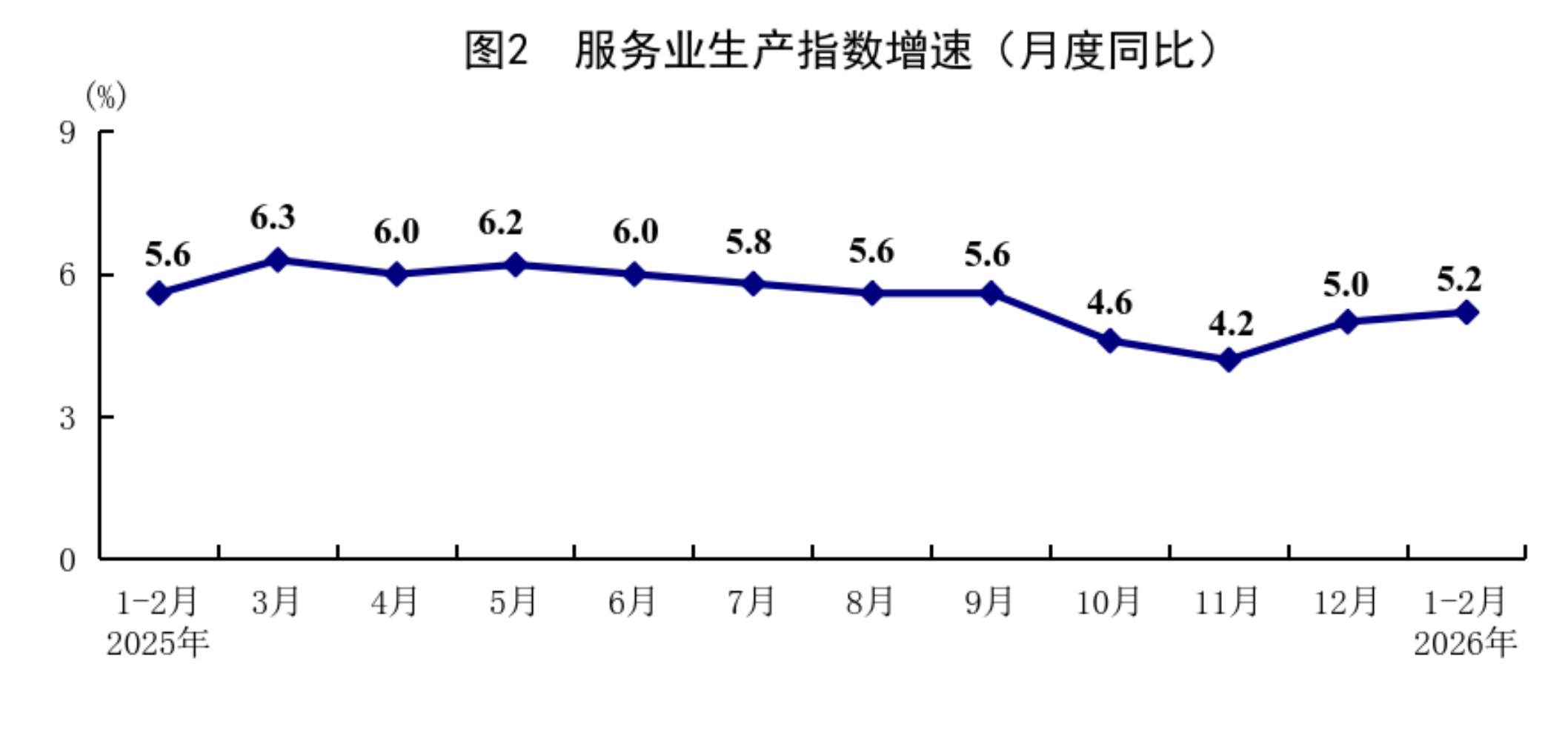 1—2月份,全國服務(wù)業(yè)生產(chǎn)指數(shù)同比增長5.2%,比上年12月份加快0.2個百分點。分行業(yè)看,信息傳輸、軟件和信息技術(shù)服務(wù)業(yè),租賃和商務(wù)服務(wù)業(yè),金融業(yè),交通運輸、倉儲和郵政業(yè),住宿和餐飲業(yè)生產(chǎn)指數(shù)分別增長10.1%、8.2%、7.0%、6.3%、5.4%。2月份,服務(wù)業(yè)商務(wù)活動指數(shù)為49.7%,比上月上升0.2個百分點;服務(wù)業(yè)業(yè)務(wù)活動預(yù)期指數(shù)為55.8%。其中,住宿、餐飲、文化體育娛樂等行業(yè)商務(wù)活動指數(shù)位于60.0%以上高位景氣區(qū)間。