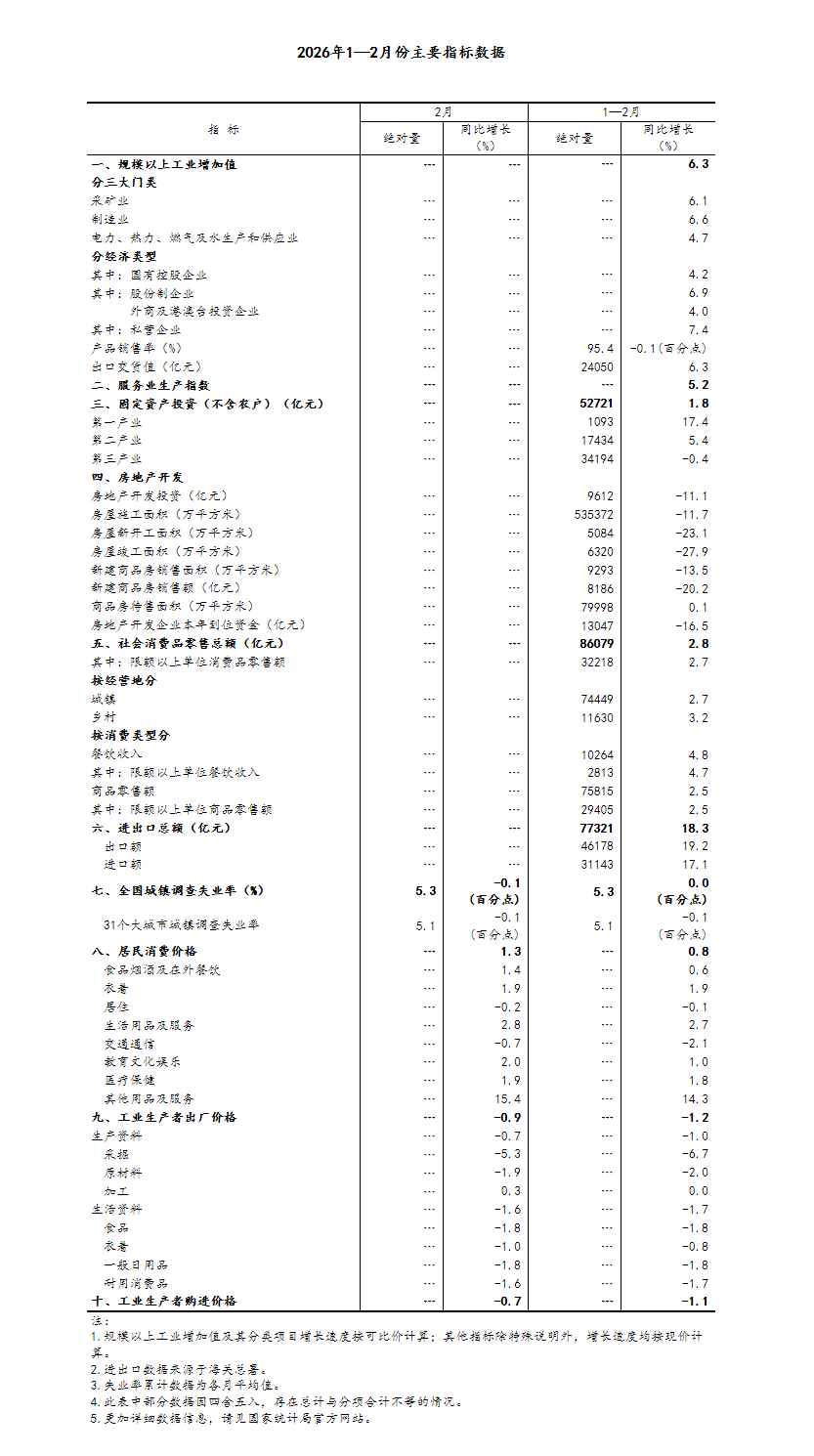 中國網(wǎng)3月16日訊 國家統(tǒng)計局網(wǎng)站3月16日發(fā)布消息,1—2月份,在以習近平同志為核心的黨中央堅強領(lǐng)導(dǎo)下,各地區(qū)各部門認真落實黨中央、國務(wù)院決策部署,堅持穩(wěn)中求進工作總基調(diào),實施更加積極有為的宏觀政策,加大逆周期和跨周期調(diào)節(jié),持續(xù)擴大內(nèi)需、優(yōu)化供給,做優(yōu)增量、盤活存量,生產(chǎn)供給增長加快,市場需求穩(wěn)中有升,就業(yè)物價總體穩(wěn)定,新質(zhì)生產(chǎn)力成長壯大,經(jīng)濟運行起步有力,實現(xiàn)良好開局。