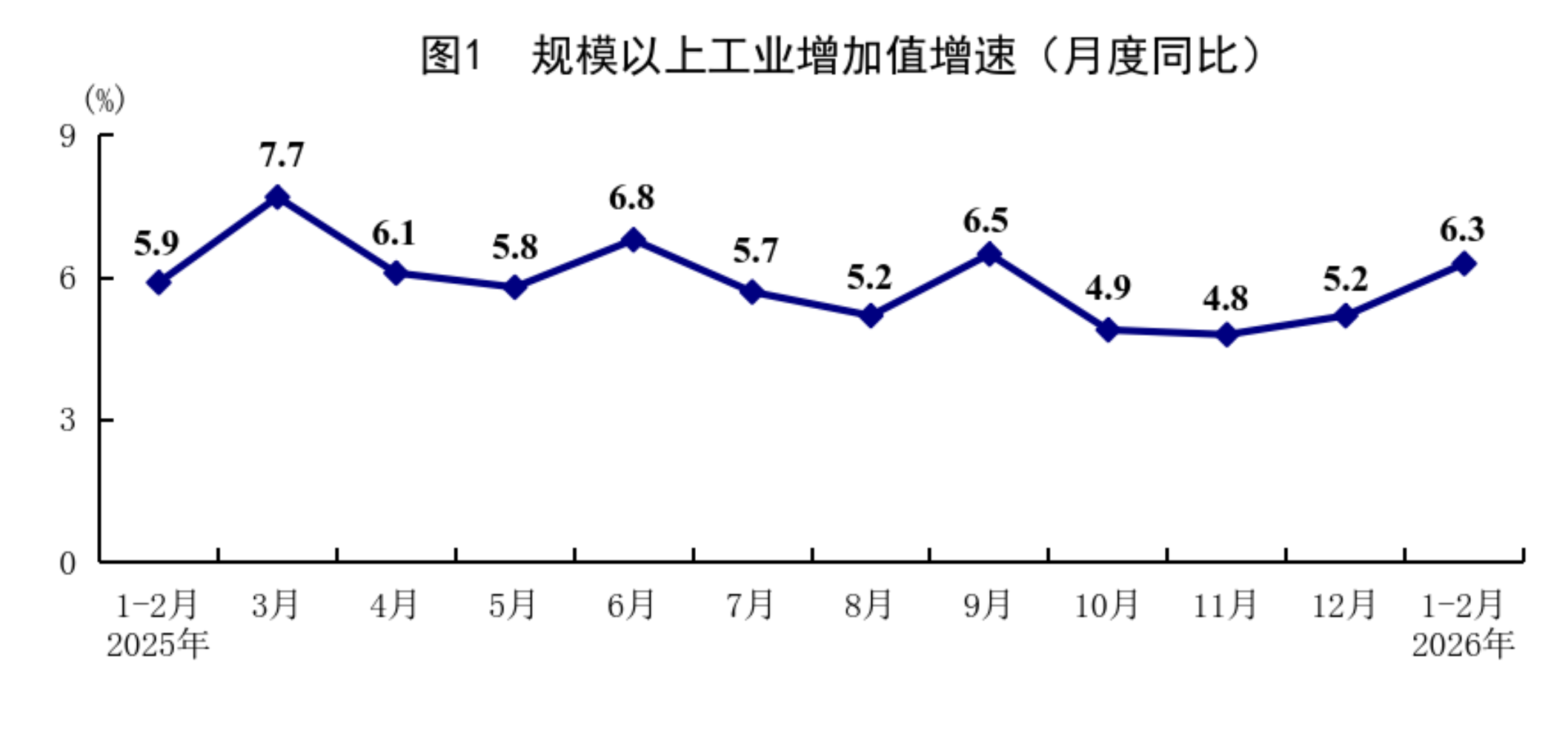 1—2月份,全國規(guī)模以上工業(yè)增加值同比增長6.3%,比上年12月份加快1.1個百分點。分三大門類看,采礦業(yè)增加值同比增長6.1%,制造業(yè)增長6.6%,電力、熱力、燃氣及水生產(chǎn)和供應(yīng)業(yè)增長4.7%。裝備制造業(yè)增加值同比增長9.3%,高技術(shù)制造業(yè)增加值增長13.1%,分別快于全部規(guī)模以上工業(yè)增加值3.0和6.8個百分點。分經(jīng)濟類型看,國有控股企業(yè)增加值同比增長4.2%;股份制企業(yè)增長6.9%,外商及港澳臺投資企業(yè)增長4.0%;私營企業(yè)增長7.4%。分產(chǎn)品看,3D打印設(shè)備、鋰離子電池、工業(yè)機器人產(chǎn)品產(chǎn)量同比分別增長54.1%、42.6%、31.1%。從環(huán)比看,2月份規(guī)模以上工業(yè)增加值比上月增長0.83%。2月份,制造業(yè)采購經(jīng)理指數(shù)為49.0%;企業(yè)生產(chǎn)經(jīng)營活動預(yù)期指數(shù)為53.2%,比上月上升0.6個百分點。