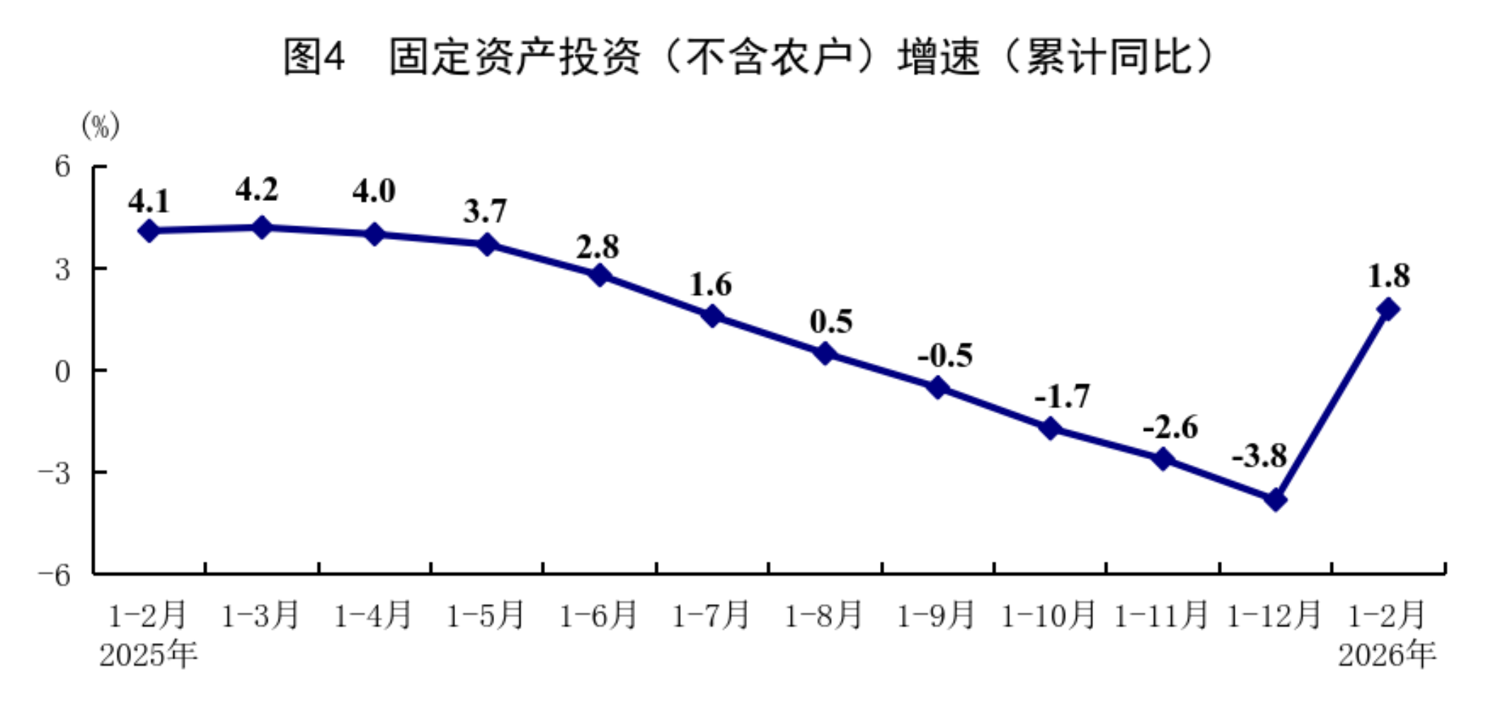 1—2月份,全國固定資產(chǎn)投資(不含農(nóng)戶)52721億元,同比增長1.8%,上年全年為下降3.8%;扣除房地產(chǎn)開發(fā)投資,全國固定資產(chǎn)投資增長5.2%。分領(lǐng)域看,基礎(chǔ)設(shè)施投資同比增長11.4%,制造業(yè)投資增長3.1%,房地產(chǎn)開發(fā)投資下降11.1%。全國新建商品房銷售面積9293萬平方米,同比下降13.5%;新建商品房銷售額8186億元,下降20.2%。分產(chǎn)業(yè)看,第一產(chǎn)業(yè)投資同比增長17.4%,第二產(chǎn)業(yè)投資增長5.4%,第三產(chǎn)業(yè)投資下降0.4%。民間投資同比下降2.6%,降幅比上年全年收窄3.8個百分點;扣除房地產(chǎn)開發(fā)投資,民間投資增長1.0%。高技術(shù)產(chǎn)業(yè)投資同比增長5.1%,其中航空、航天器及設(shè)備制造業(yè),研發(fā)與設(shè)計服務(wù)業(yè),信息服務(wù)業(yè)投資分別增長20.2%、20.6%、16.5%。從環(huán)比看,2月份固定資產(chǎn)投資(不含農(nóng)戶)比上月增長0.39%。