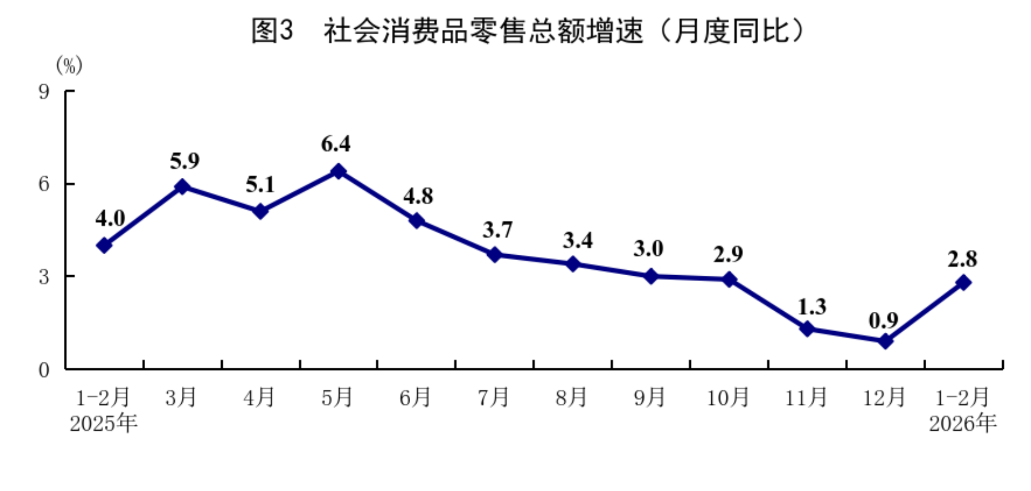1—2月份,社會消費品零售總額86079億元,同比增長2.8%,比上年12月份加快1.9個百分點。按經(jīng)營單位所在地分,城鎮(zhèn)消費品零售額74449億元,增長2.7%;鄉(xiāng)村消費品零售額11630億元,增長3.2%。按消費類型分,商品零售額75815億元,增長2.5%;餐飲收入10264億元,增長4.8%。基本生活類和部分升級類商品銷售增長較快。限額以上單位服裝鞋帽針紡織品類、糧油食品類、通訊器材類、金銀珠寶類商品零售額同比分別增長10.4%、10.2%、17.8%、13.0%。從環(huán)比看,2月份社會消費品零售總額比上月增長0.81%。1—2月份,服務(wù)零售額同比增長5.6%,比上年全年加快0.1個百分點。其中,通訊信息服務(wù)類、旅游咨詢租賃服務(wù)類、文體休閑服務(wù)類零售額較快增長。1—2月份,全國網(wǎng)上商品和服務(wù)零售額32546億元,同比增長9.2%。其中,網(wǎng)上商品零售額20812億元,增長10.3%,占社會消費品零售總額的比重為24.2%;網(wǎng)上服務(wù)零售額11734億元,增長7.3%。