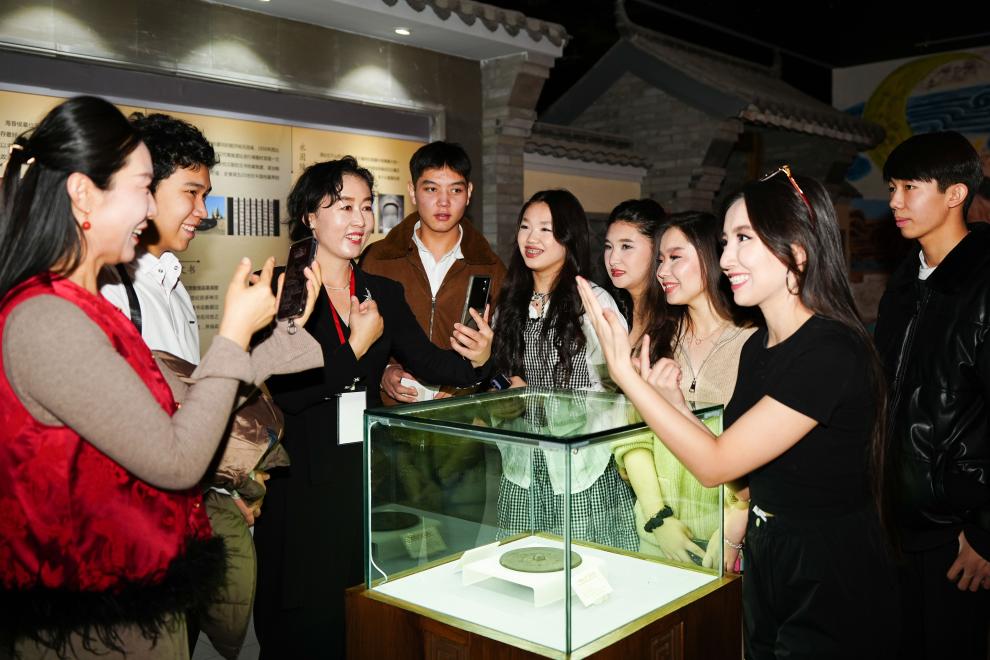2025年11月28日,在新疆中哈霍爾果斯國際邊境合作中心中國文化館,來自哈薩克斯坦的青年參觀中國歷史文化展。新華社記者 徐宏巖 攝