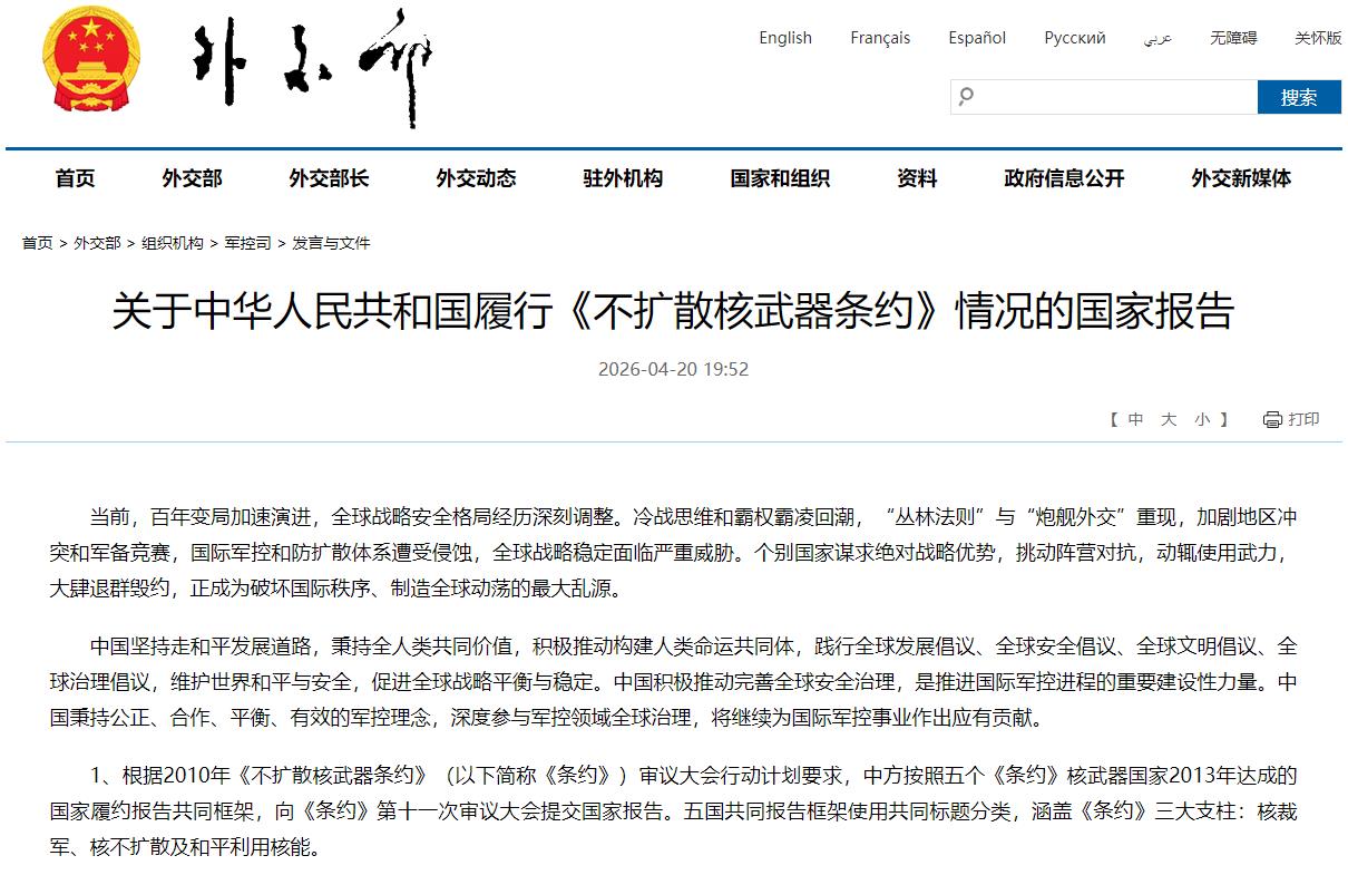 27、近年來,中國通過一系列政府文件公開宣示核政策,保持高度透明。中國自1995年以來先后發(fā)布四份軍控和防擴(kuò)散白皮書,2025年11月發(fā)布最新版《新時代的中國軍控、裁軍與防擴(kuò)散》白皮書。1998年至2019年期間,中國先后發(fā)布10份國防白皮書。在上述文件中,中國對本國核戰(zhàn)略、核政策及核軍控政策等作出明確闡述。