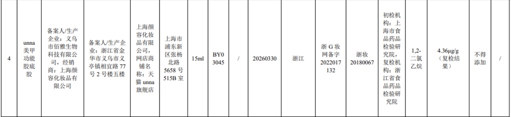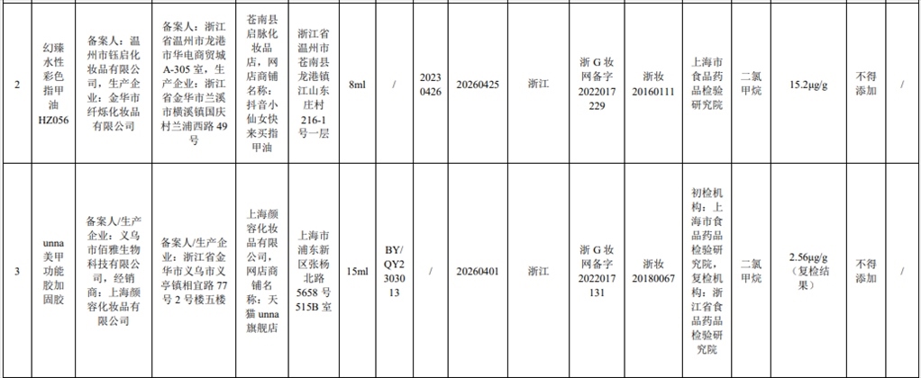 根據通告,在2023年國家化妝品抽樣檢驗工作中,經上海市食品藥品檢驗研究院等單位檢驗,產品標簽標示委托方為溫州市鈺啟化妝品有限公司、受托生產企業(yè)為金華市纖爍化妝品有限公司生產的幻臻水性彩色指甲油HZ088等7批次化妝品不符合規(guī)定,檢出《化妝品安全技術規(guī)范(2015年版)》中規(guī)定的禁用原料。