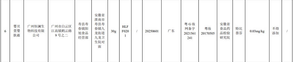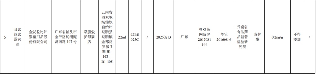 記者注意到,此次通報的7批次含禁用物質化妝品,其中2批次是嬰童產品。產品標簽標示為金發(fā)拉比婦嬰童用品股份有限公司生產的貝比拉比蛋黃油被檢出含有黃體酮;產品標簽標示為廣州恒瀾生物科技有限公司生產的嬰貝萱嬰膚霜被檢出含有特比萘芬。