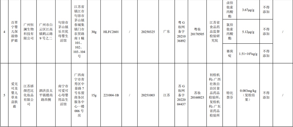 記者注意到,這6批次化妝品中還出現(xiàn)了嬰童用品。其中,產(chǎn)品標(biāo)簽標(biāo)示為廣州恒瀾生物科技有限公司生產(chǎn)的百萃寧嬰兒保濕修護(hù)霜檢出不得添加的鹵倍他索丙酸酯、氯倍他索丙酸酯、賽庚啶。