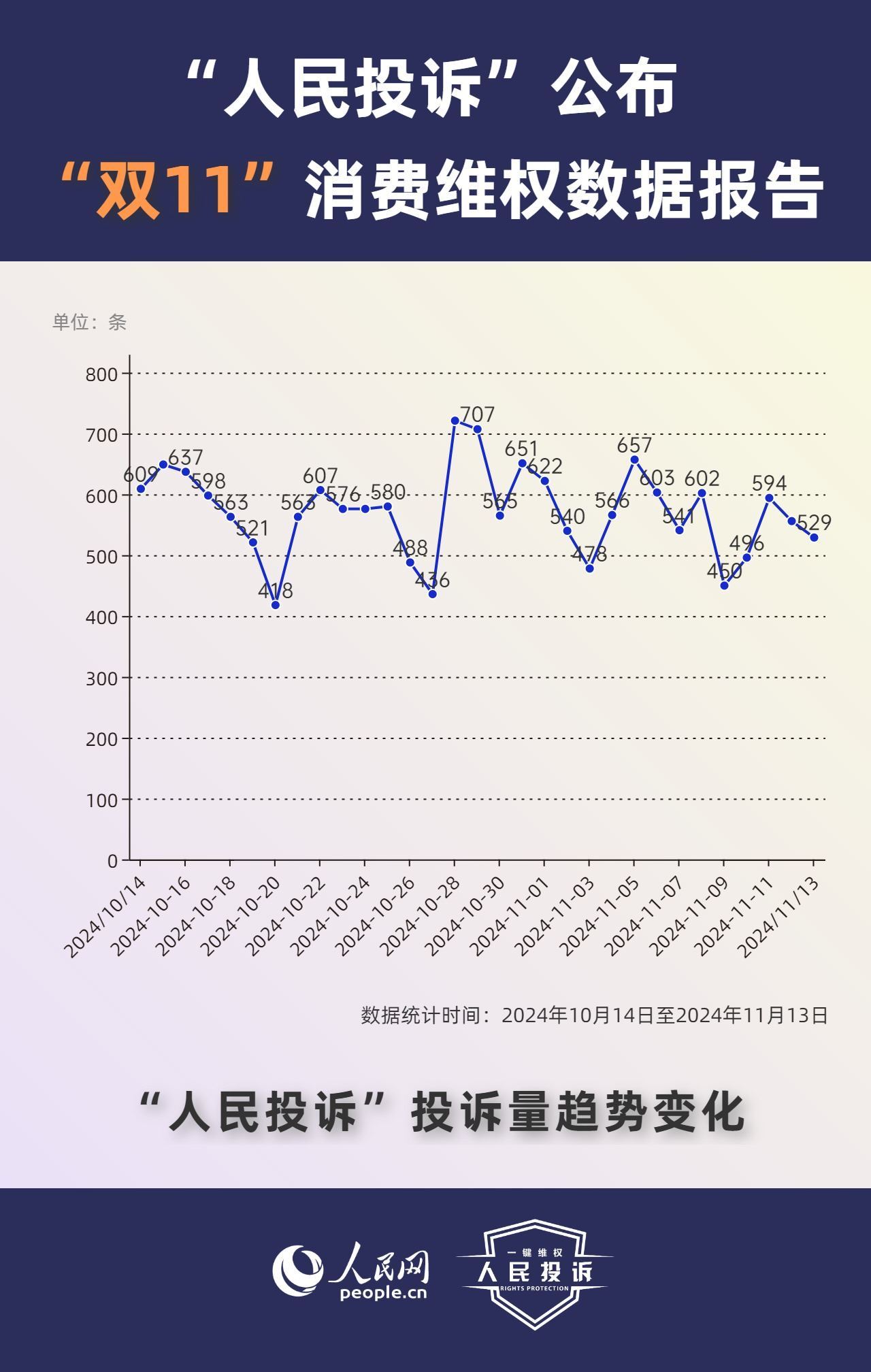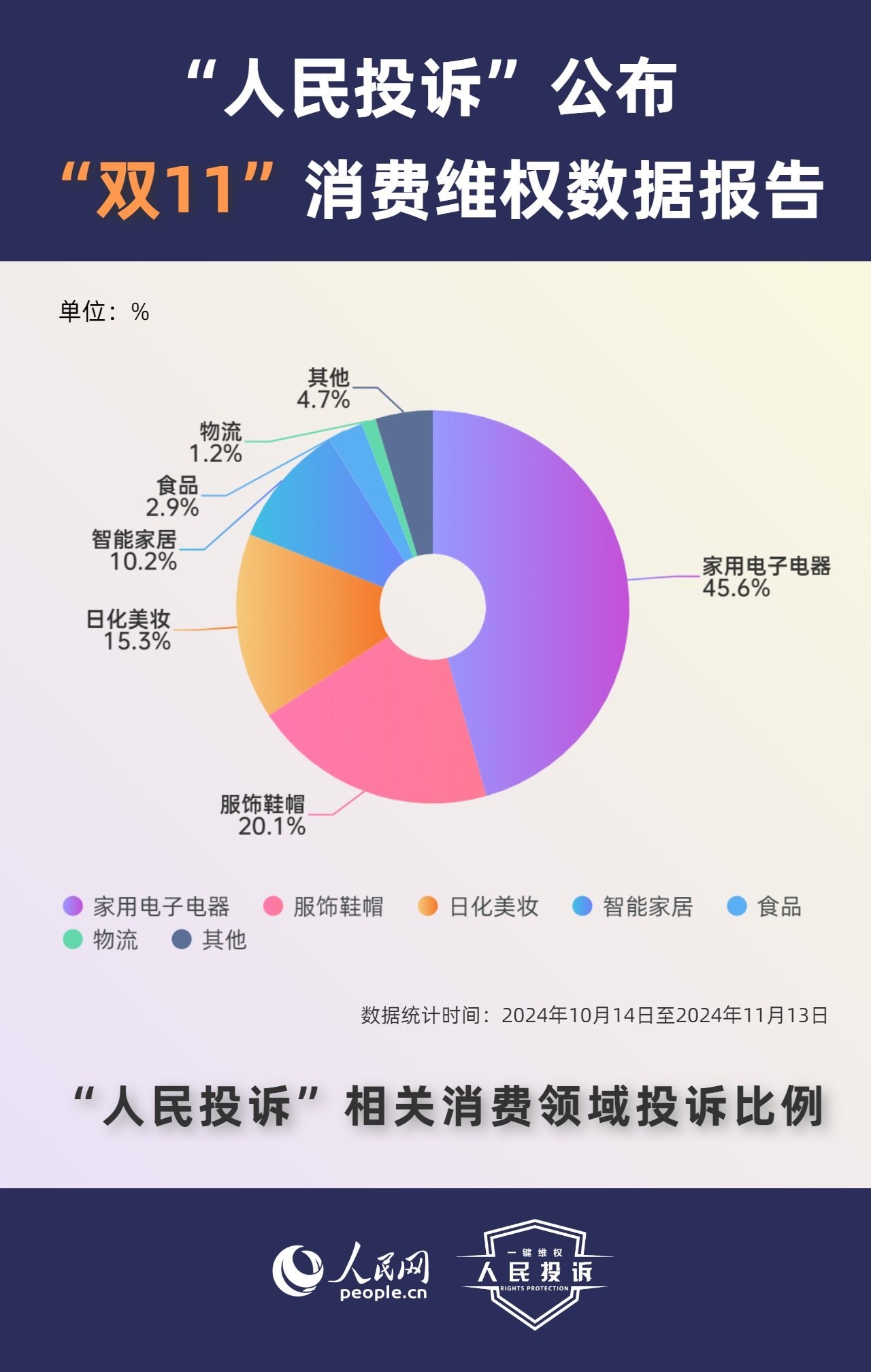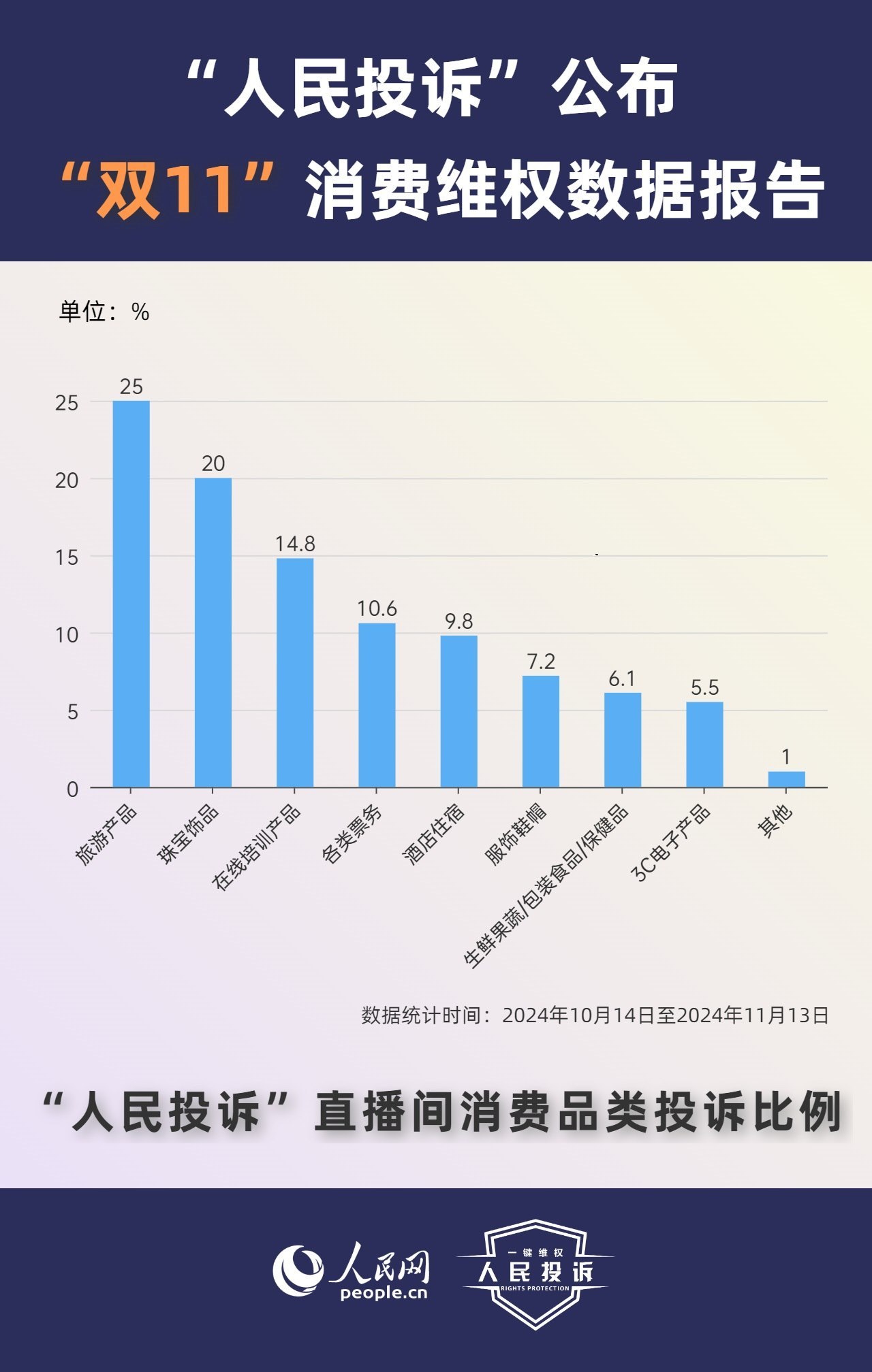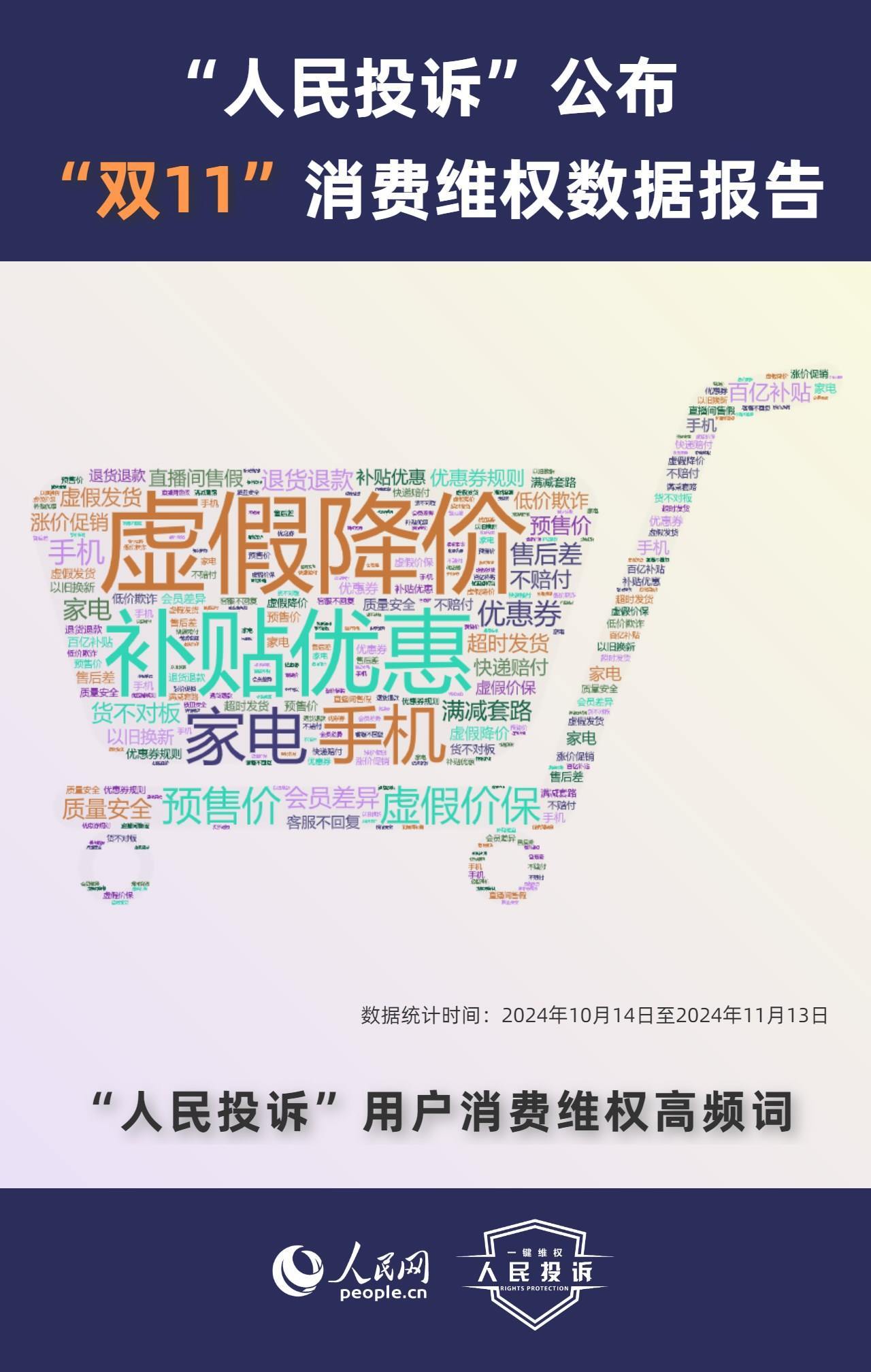 那么,今年你的“雙11”購物還遇到了哪些“套路”?據(jù)人民網(wǎng)“人民投訴”平臺統(tǒng)計,“雙11”期間平臺共收到17699條(數(shù)據(jù)統(tǒng)計從2024年10月14日-11月13日)投訴信息。其中,手機(jī)、家電、智能產(chǎn)品、美妝服飾等消費(fèi)領(lǐng)域維權(quán)量大;平臺“國補(bǔ)”“以舊換新”等優(yōu)惠規(guī)則不透明,保價服務(wù)藏“貓膩”,直播間虛假“破價”,“百億補(bǔ)貼”商品貨不對板,“高價預(yù)售”欺詐等問題反映突出。
