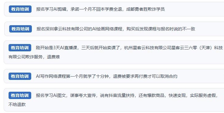 然而,“人民投訴”經梳理發(fā)現(xiàn),網絡上不少消費者吐槽相關課程質量良莠不齊,與廣告承諾“免費領取AI應用體驗課及AI工具”“低投入、高回報”“副業(yè)賺錢”“快速變現(xiàn)”等內容大相徑庭。相關商家虛假宣傳、誘導消費、貨不對板以及退費難等問題被反復提及。