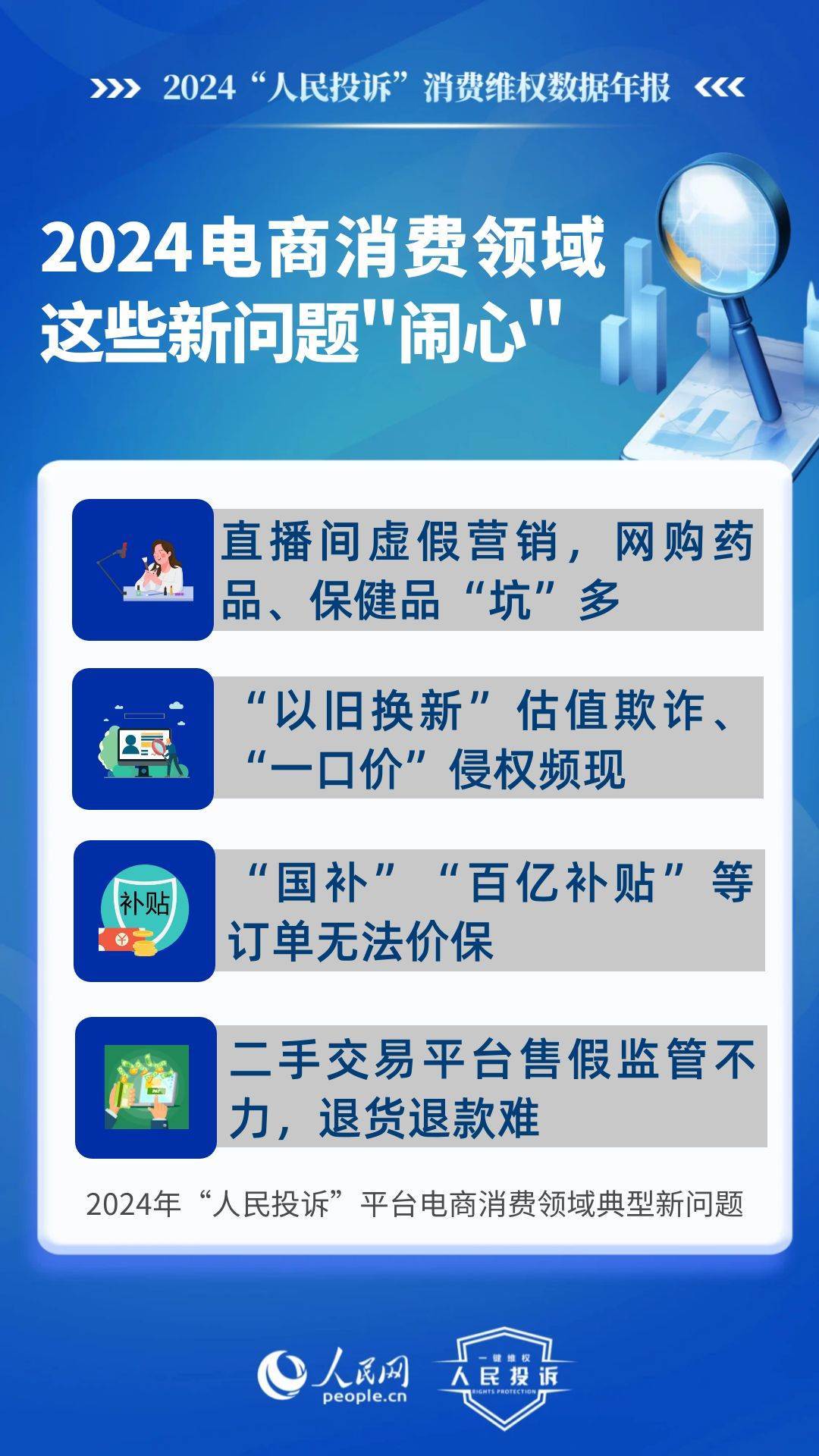 新問題體現(xiàn)在:直播間虛假營銷,購買玉石/網(wǎng)課/旅游產(chǎn)品等消費“踩雷”多;“以舊換新”估值欺詐、“一口價”侵權(quán)頻現(xiàn);“國補(bǔ)”“百億補(bǔ)貼”訂單不給價保;二手交易平臺對商家售假監(jiān)管不力、“陰陽”檢測、退貨退款難;網(wǎng)購藥品/保健品/醫(yī)療器械“坑”多等。