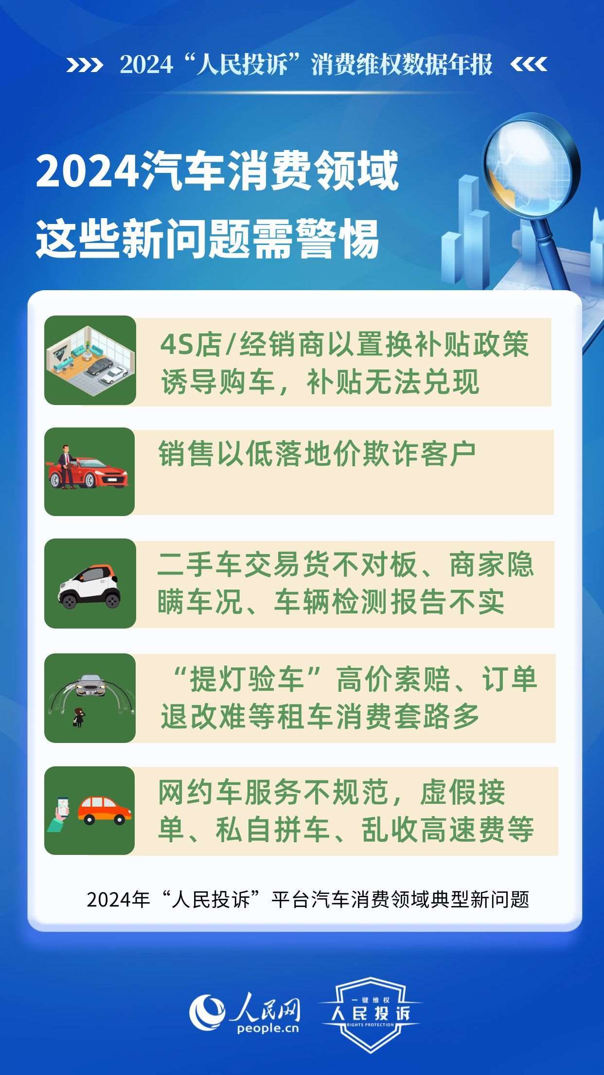 新問題體現(xiàn)在:4S店/經(jīng)銷商以置換補(bǔ)貼政策誘導(dǎo)購車,結(jié)果補(bǔ)貼無法兌現(xiàn);銷售以低落地價欺詐客戶;二手車交易貨不對板、商家隱瞞車況、平臺車輛檢測報告不實;惡意租“故障車”、“提燈驗車”高價索賠、低價誘租、訂單退改難等租車消費套路多;網(wǎng)約車服務(wù)不規(guī)范,人車不符、虛假接單、私自拼車、亂收高速費等。