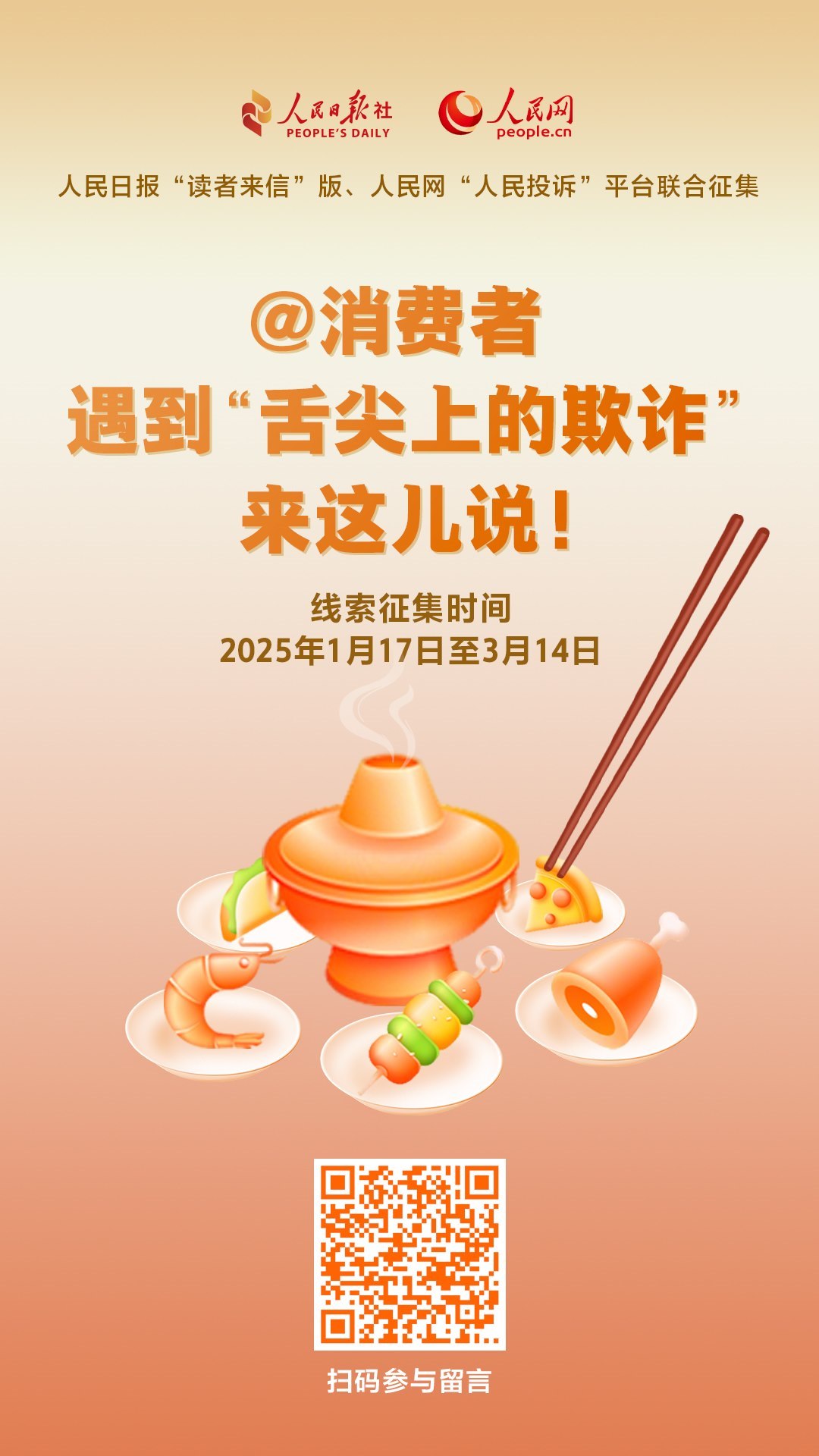 牛肉干里不含牛肉,無糖產(chǎn)品其實含糖,配料表造假、營養(yǎng)成分表不準確……你遇到過嗎?“以假亂真”“以次充好”為代表的食品欺詐,嚴重損害消費者利益,擾亂市場公平競爭秩序。為筑牢食品安全防線,增強消費者信心,即日起,人民日報“讀者來信”版與人民網(wǎng)“人民投訴”平臺聯(lián)合發(fā)起相關(guān)線索征集,歡迎您掃描上方海報二維碼進入征集頁面留言或提供調(diào)查線索至人民日報“讀者來信”版(郵箱:dzlx@peopledaily.cn 傳真:010-65368495)。線索征集時間截至2025年3月14日。