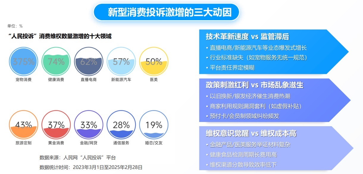 “人民投訴”綜合分析,技術(shù)驅(qū)動新業(yè)態(tài)與監(jiān)管未能同步、政策刺激紅利與市場亂象并存、維權(quán)意識提升與維權(quán)成本矛盾這三大因素共同成為推高新型消費領(lǐng)域風(fēng)險的原因。
