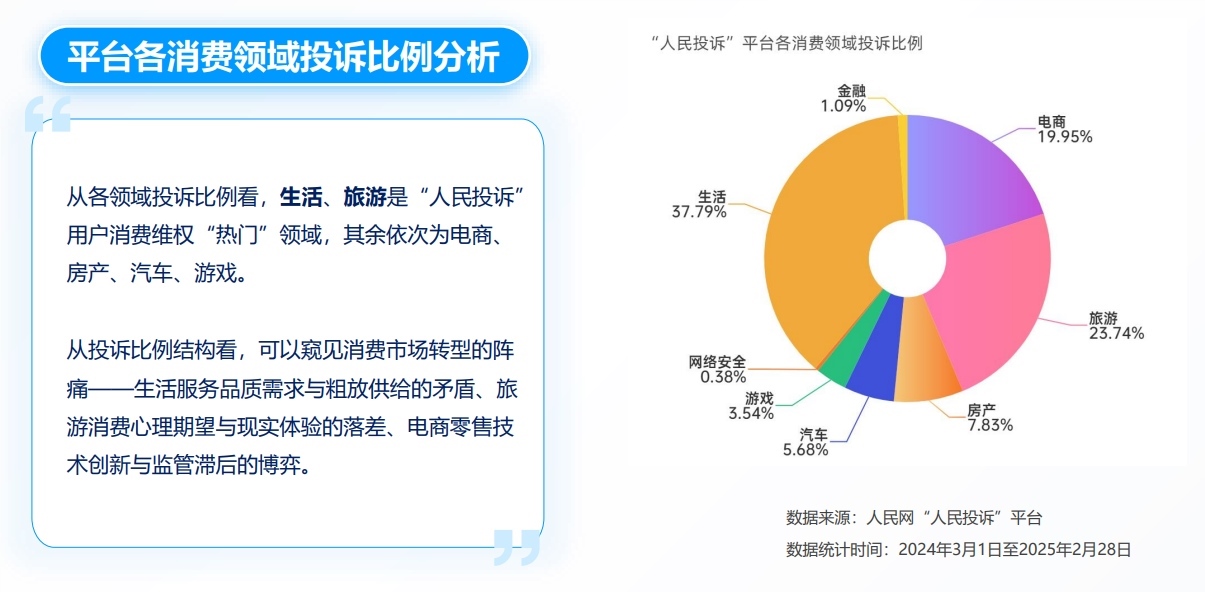 消費是拉動經(jīng)濟增長的“主引擎”,也是人民美好生活需要的直接體現(xiàn)。在“3·15”國際消費者權(quán)益日到來之際,人民網(wǎng)“人民投訴”平臺(以下簡稱“人民投訴”)發(fā)布最新“3·15”消費維權(quán)數(shù)據(jù)報告,分析總結(jié)過去一年來線上消費維權(quán)的特點、成效及問題,思考在AI重構(gòu)商業(yè)生態(tài)、數(shù)字經(jīng)濟深度融合、消費新業(yè)態(tài)快速迭代的背景下,消費者權(quán)益保護出現(xiàn)哪些新挑戰(zhàn)以及如何破題。