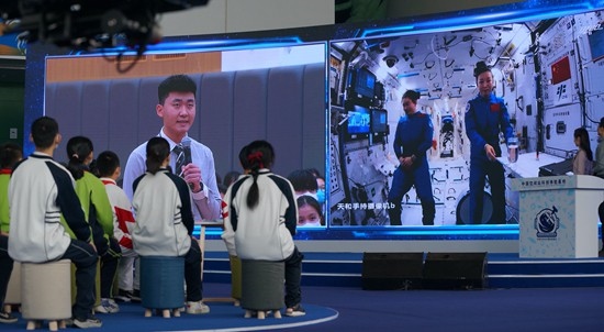 12月9日,中國空間站“天宮課堂”第一課正式開講,此次授課活動(dòng)在中國科技館設(shè)地面主課堂,在廣西南寧、四川汶川、香港、澳門分設(shè)4個(gè)地面分課堂,共1420名中小學(xué)生代表參加現(xiàn)場活動(dòng)。圖為青少年向航天員提問。中國科技館供圖