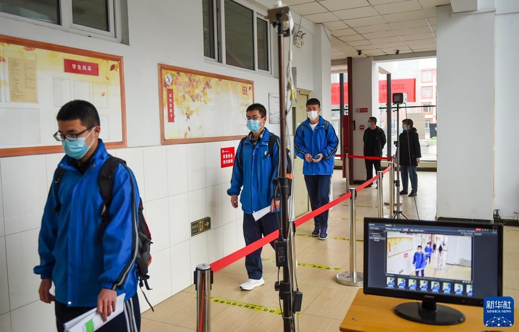 4月1日,高三年級學(xué)生走進(jìn)呼和浩特市鐵路第二中學(xué)教學(xué)樓,體溫檢測設(shè)備查驗(yàn)學(xué)生體溫。