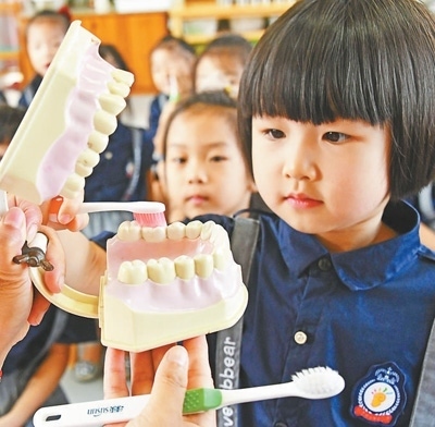 浙江省臺州市仙居縣迎暉幼兒園的小朋友正在學習正確的刷牙方法。 王華斌攝(人民視覺)