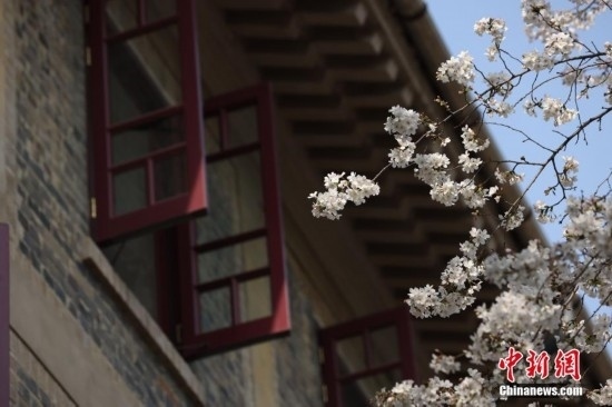 白色櫻花與青色琉璃瓦相映成畫。