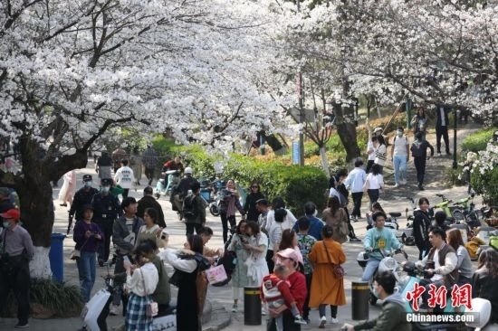 武漢大學(xué)櫻花樹下人潮涌動(dòng)。