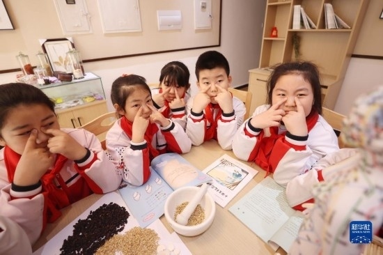3月24日,河北省廊坊市第五小學學生在該校國醫(yī)館內(nèi)跟隨老師識別中藥。