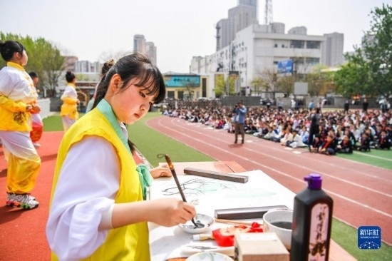 4月10日,在天津小學,學生們在操場上觀看傳統文化表演。