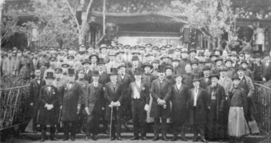 1923年4月20日,東陸大學(xué)隆重舉行新校舍奠基典禮暨大學(xué)開學(xué)典禮。奠基儀式后,唐繼堯(左5)、董澤(左1)與英、美、法、日等國領(lǐng)事、河內(nèi)大學(xué)代表、省議會議長、航空處處長等政府官員合影。云南大學(xué)供圖