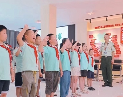 四川鹽亭縣文同小學(xué)學(xué)生在縣退役軍人之家活動中心學(xué)習(xí)英模事跡,獻(xiàn)唱少先隊隊歌。李 勤攝(人民視覺)